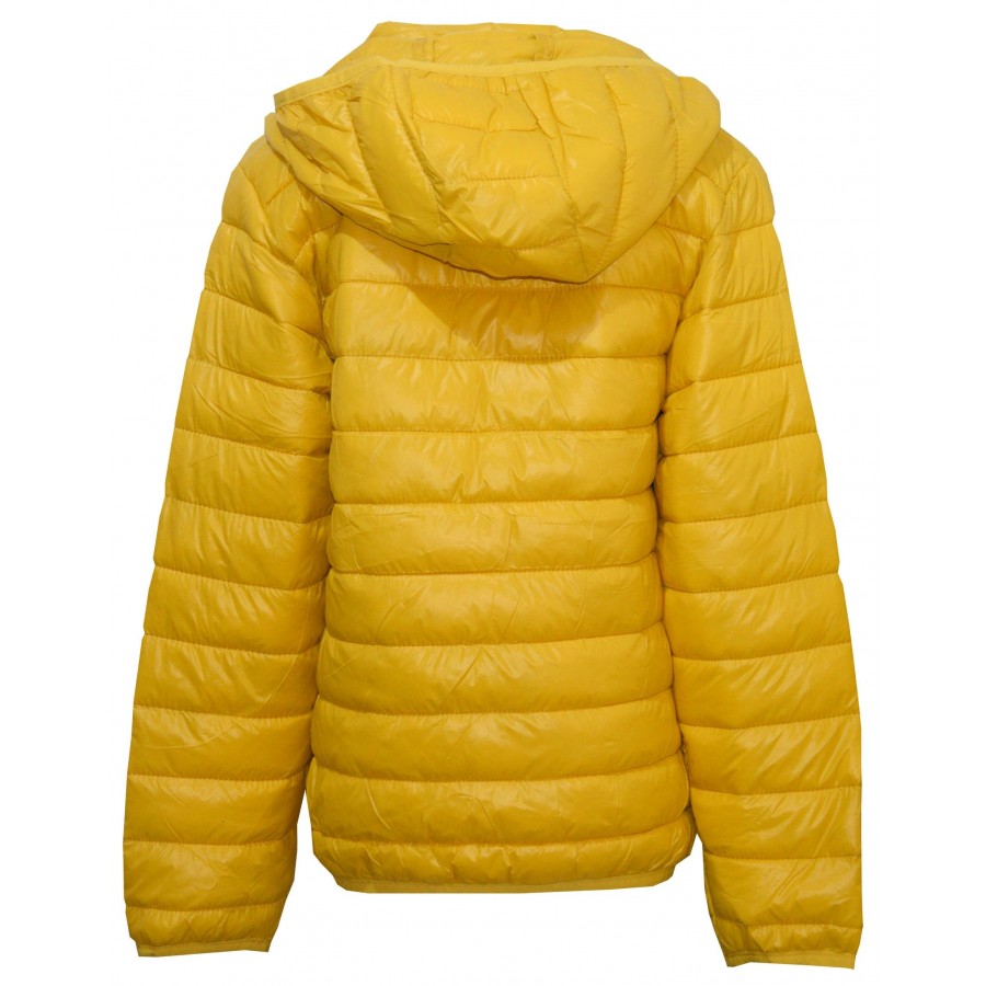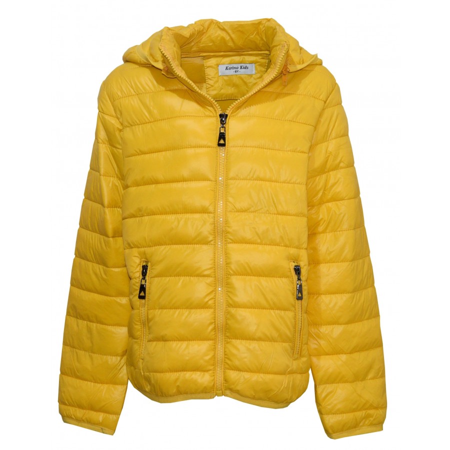 Детско яке в жълто, унисекс. Качулката на модела се сваля.