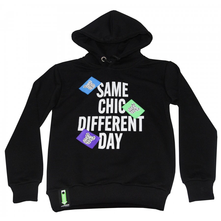 Детска блуза с качулка за момче в черно с цветна апликация надписи.