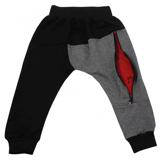 Детски комплект от три части за момче. Тениската е в червено с красива апликация. Долнището е тип потур в комбинация черно и сиво с декоративен джоб. Шапката е в черно с принт на ноти.