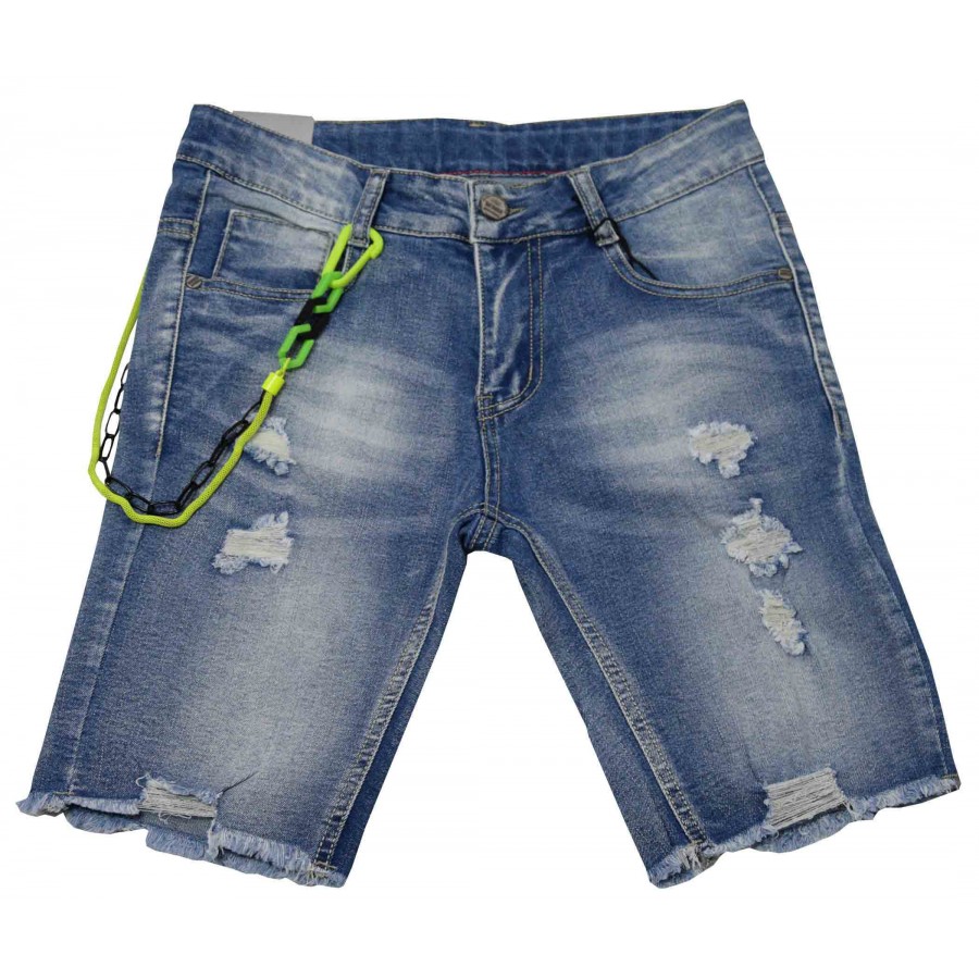 Детски дънкови бермуди за момче с накъсан ефект и аксесоар верига.