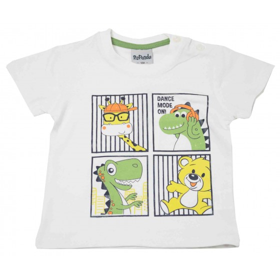 Детски комплект от две части за момче. Тениската е в бяло с апликация надписи. Късите панталони са в тъмносиньо с надписи.