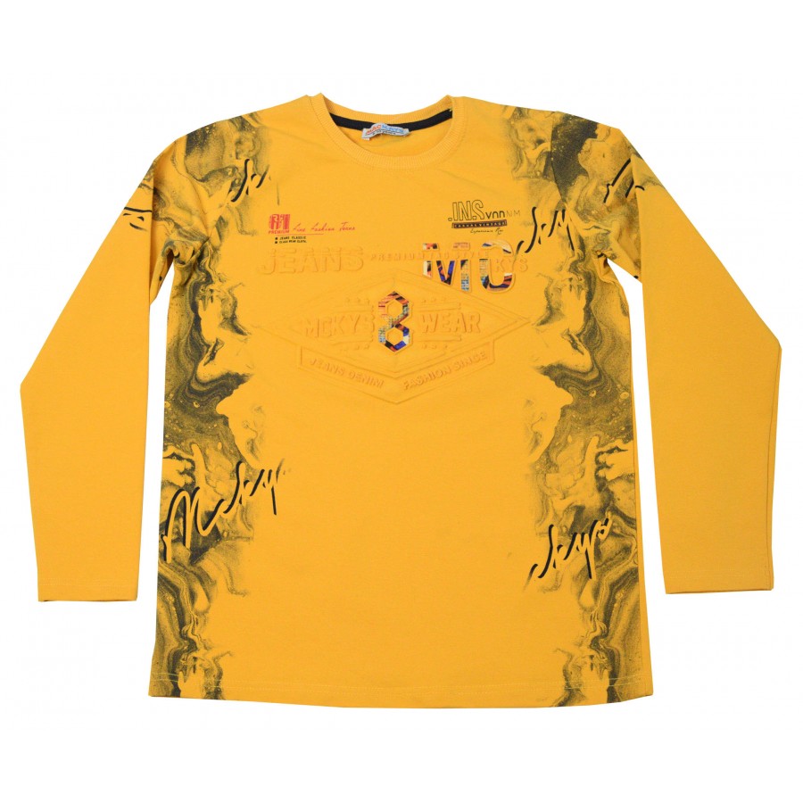Детска блуза за момче в жълто с цветен принт и релефни надписи.