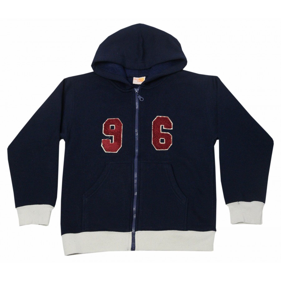 Красив детски ватиран суитшърт за момче, изработен от висококачествена материя. Модела е в тъмносин цвят с качулка, апликация на числа, джобове, закопчаването е с цип за лесно обличане и събличане. Суитшърта идеално се комбинира с долнища или дънки. Лесен е за поддръжка, може да се пере в пералня без риск от загуба на форма или цвят.