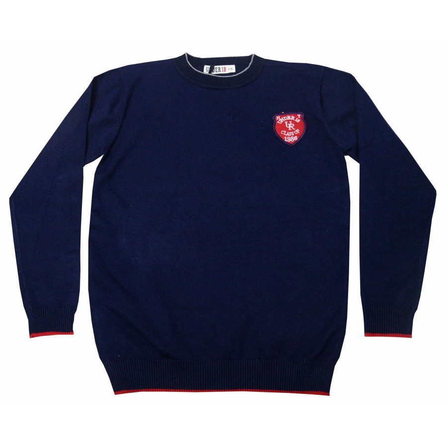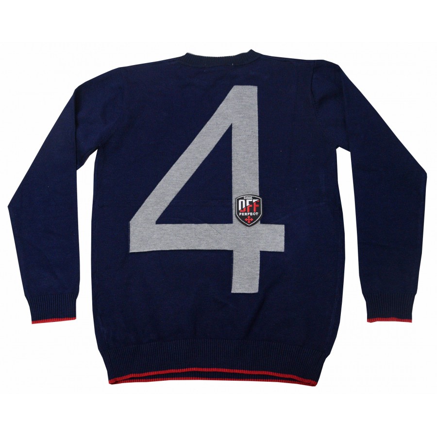 Детски пуловр за момче от фино плетиво в тъмносиньо с емблема в предната част и апликация число на гърба.