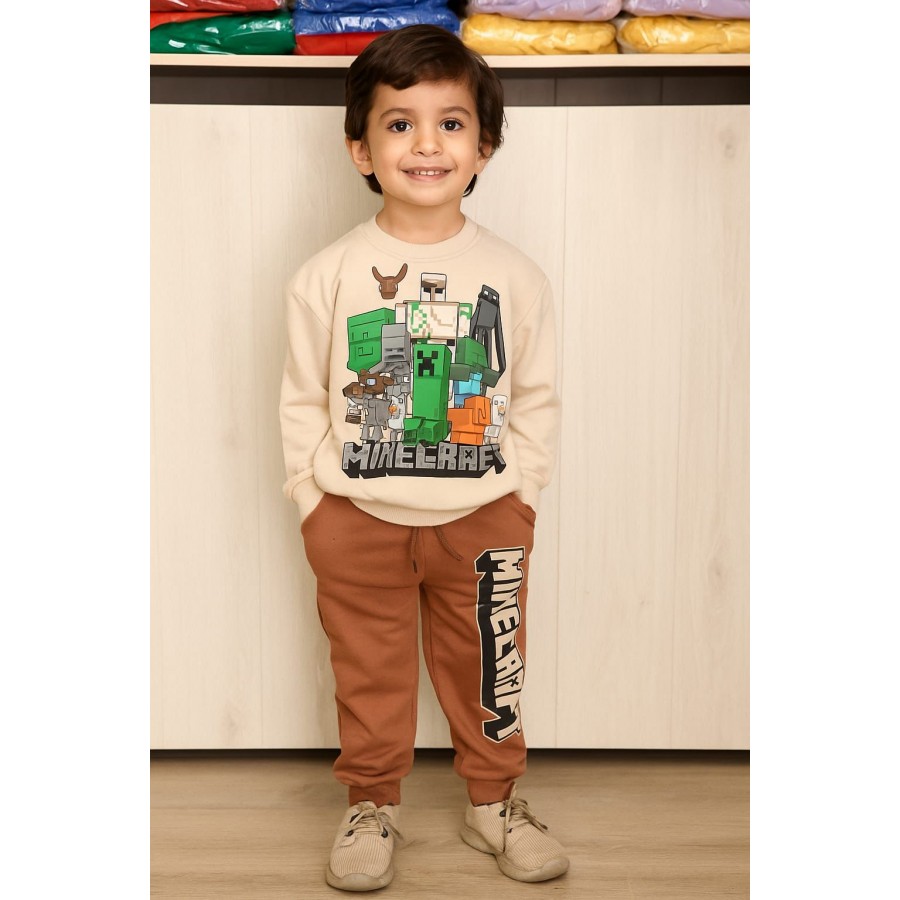 Детски комплект за момче от две части, изработен от висококачествена материя. Блузата е в бежов цвят, свободна кройка, обло бие, дълги ръкави и красива апликация. Долнището е в кафяв цвят с апликация на левия крачол, ластик на талията и на глезените. Модела е удобен и подходящ за ежедневието на Вашето момче.