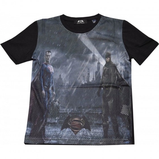 Тениска в черно с апликация герои. Предната част на модела е мрежа. Състав: 70% памук, 30% полиестер.