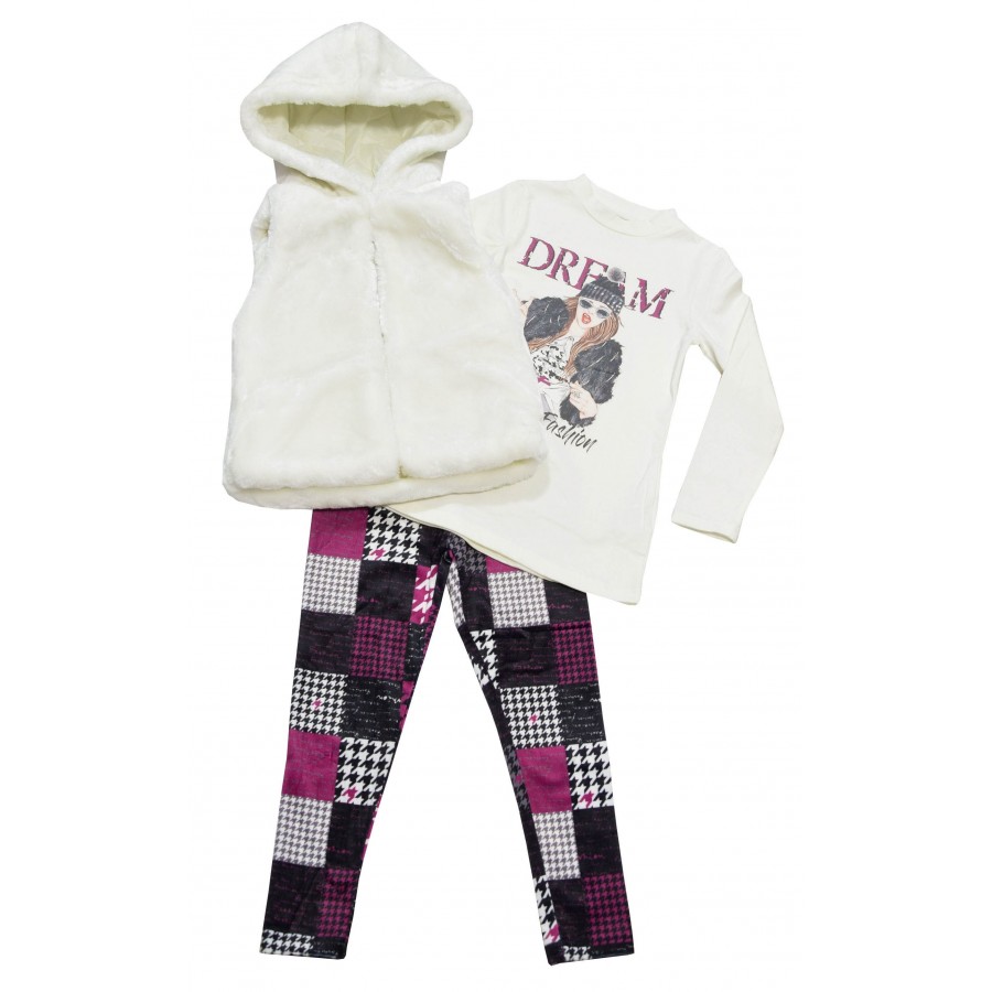 Детски комплект за момиче от три части. Елека е пухкав в екрю. Блузата е от мека материя с апликация. Клинът е от фин плюш.