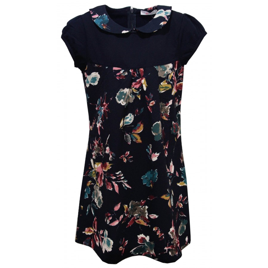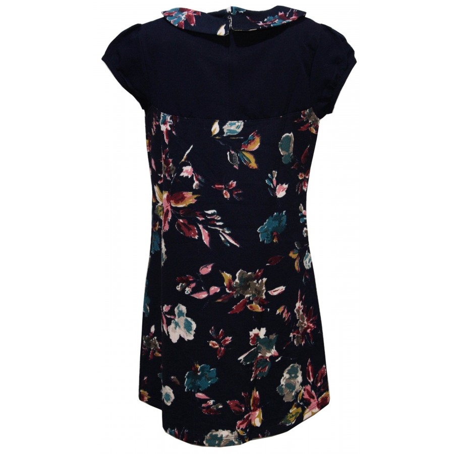 Детска рокля в тъмносиньо на цветя Unsea. Модела е с яка и цип на гърба.