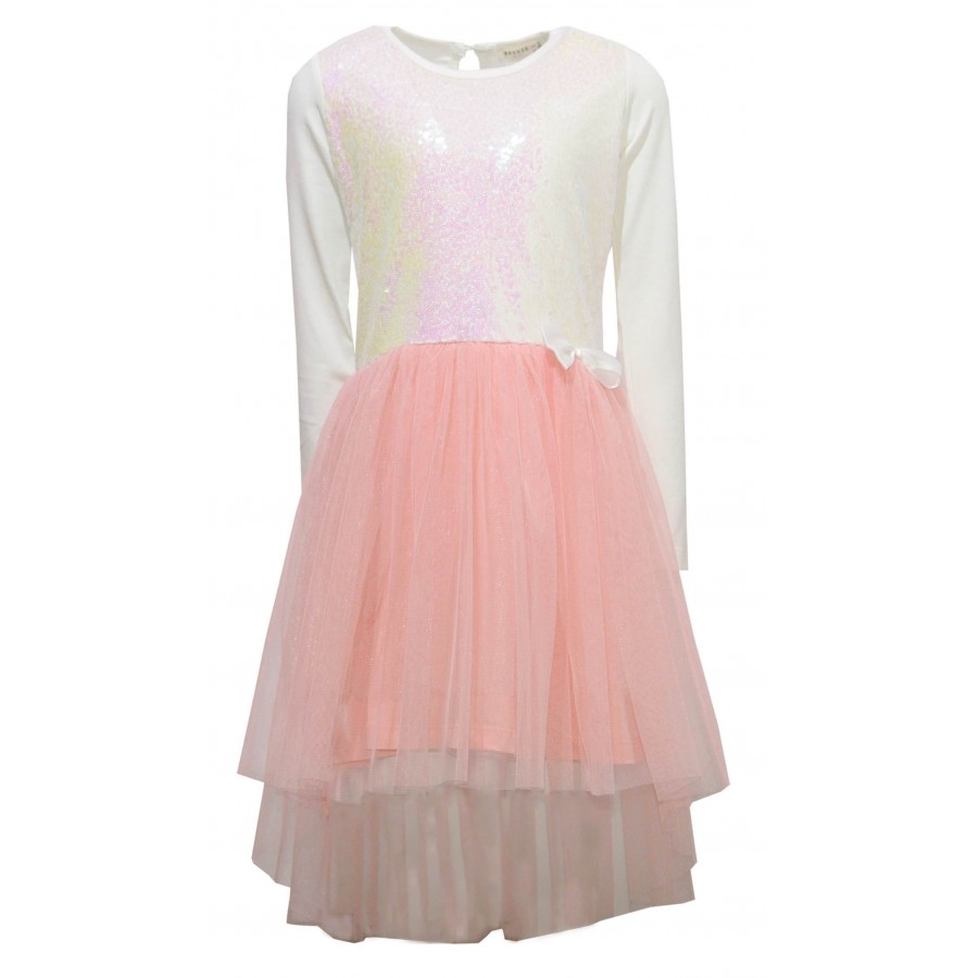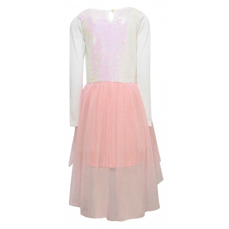 Детска рокля в екрю с пайети и розов тюл Breeze. Модела е с удължен тюл на гърба и пайети.