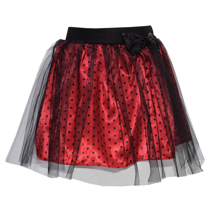 Детска пола в червено на черни точки и черен тюл. Модела има панделка с пайети на ластика на талията.