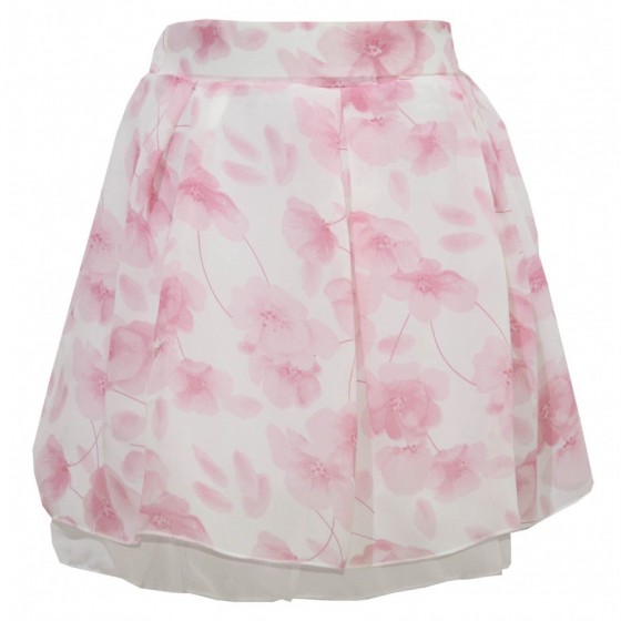 Детски комплект за момиче от три части. Tениската е в бяло с апликация. Полата е на розови цветя. Дънковото яке е къс модел с перли.
