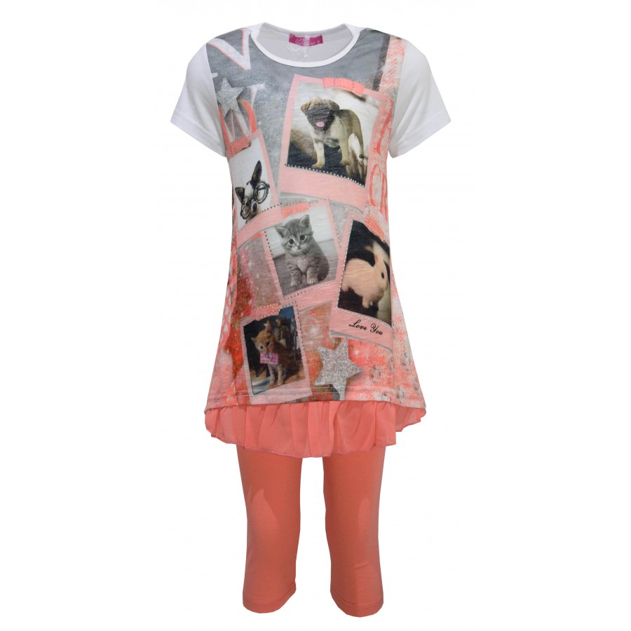Детски комплект за момиче от две части. Туниката е с красив принт и шифон в предната част. Клина е в цвят корал с 7/8 дължина.