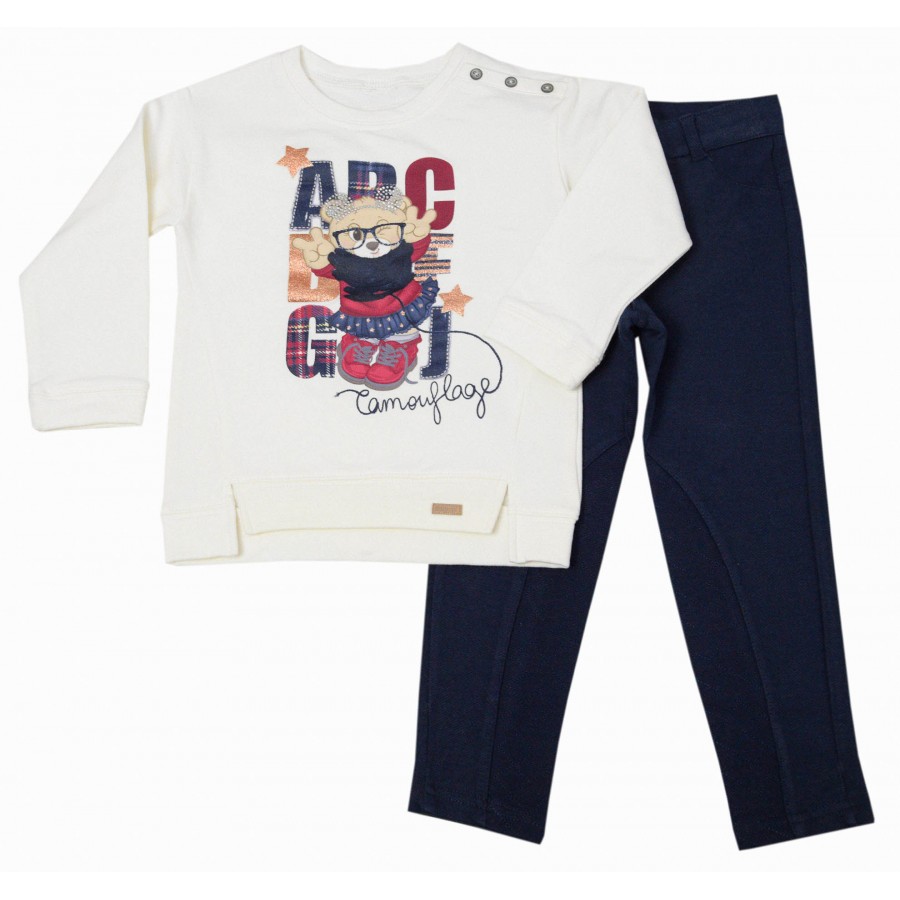 Красив детски комплект за момиче от две части с туника и панталон. Модела е изработен от висококачествена материя. Блузата е в цвят екрю с красива апликация на мече с декоративни копчета на лявото рамо, обло бие и дълги ръкави. Панталона е в тъмносиньо с декоративни шевове и закопчаване с копче. Комплекта осигурява удобство и свобода на движението през целия ден. Лесен за поддръжка, комплектът може да се пере в пералня без риск от загуба на форма или цвят.