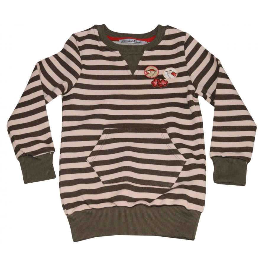 Ежедневна детска рокля в розово със зелено райе. Модела е от плътна материя с общ джоб и бродерия пиленца.
