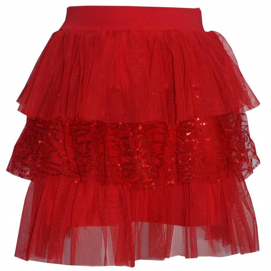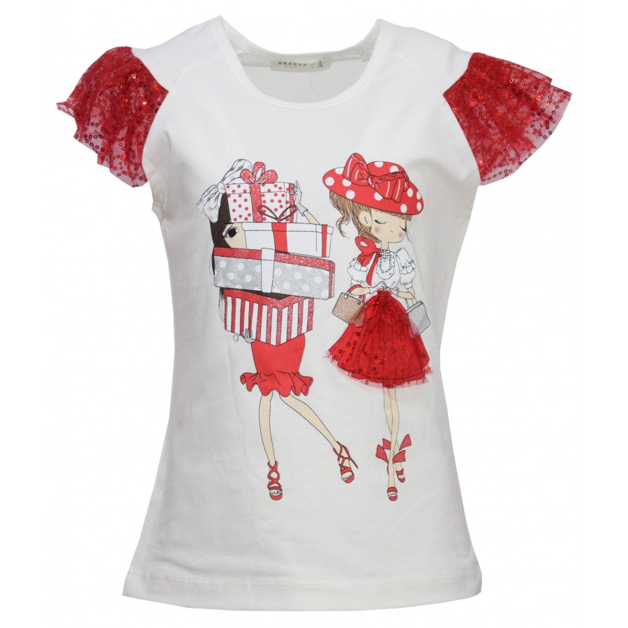 Детски комплект за момиче от две части. Тениската е в екрю с красива апликация, ръкавите са от тюл с пайети. Полата е в червено от тюл и пайети.