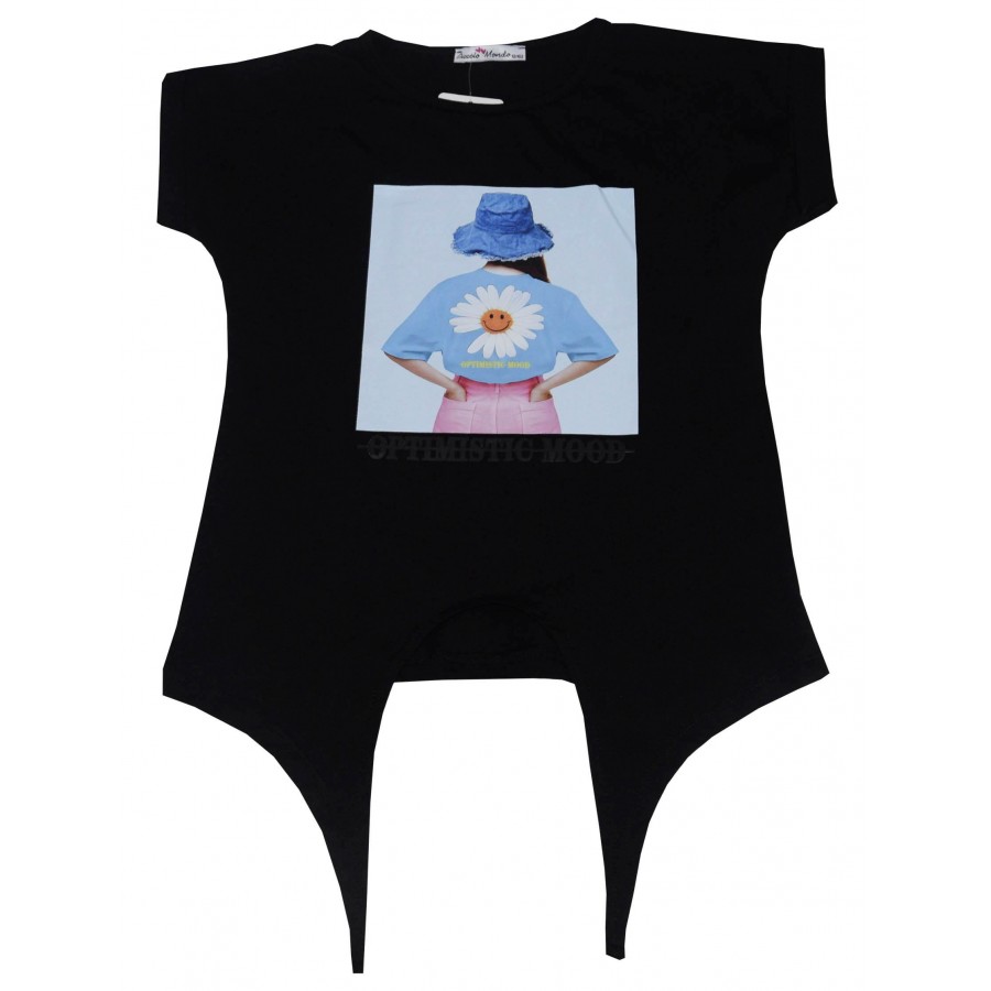 Детска тениска за момиче в черно с връзки и красива апликация.