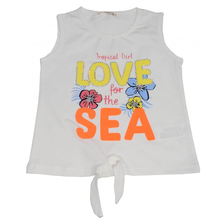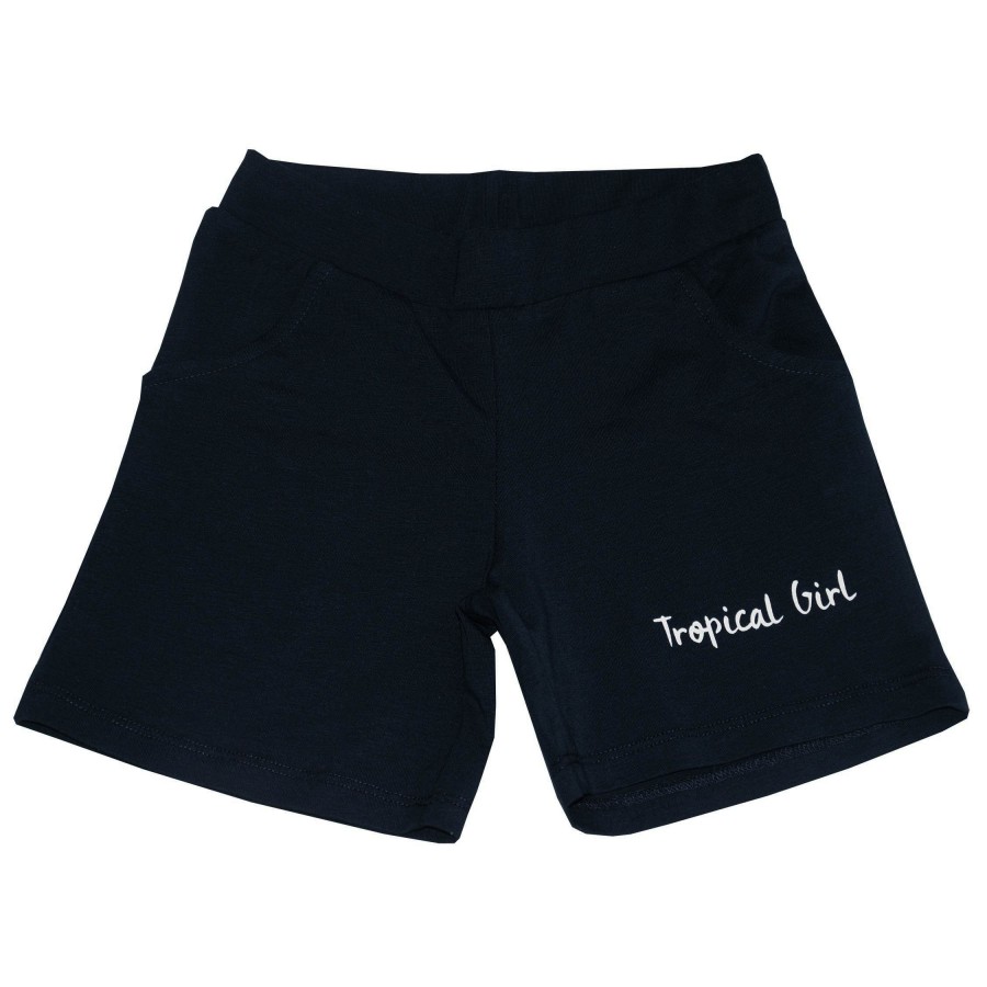Детски комплект за момиче от две части. Потника е в екрю с връзки и красива апликация. Късите панталони са в черно с надпис.