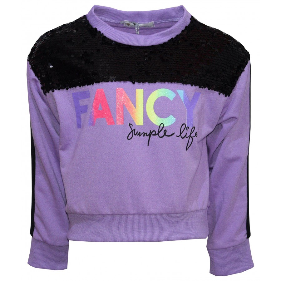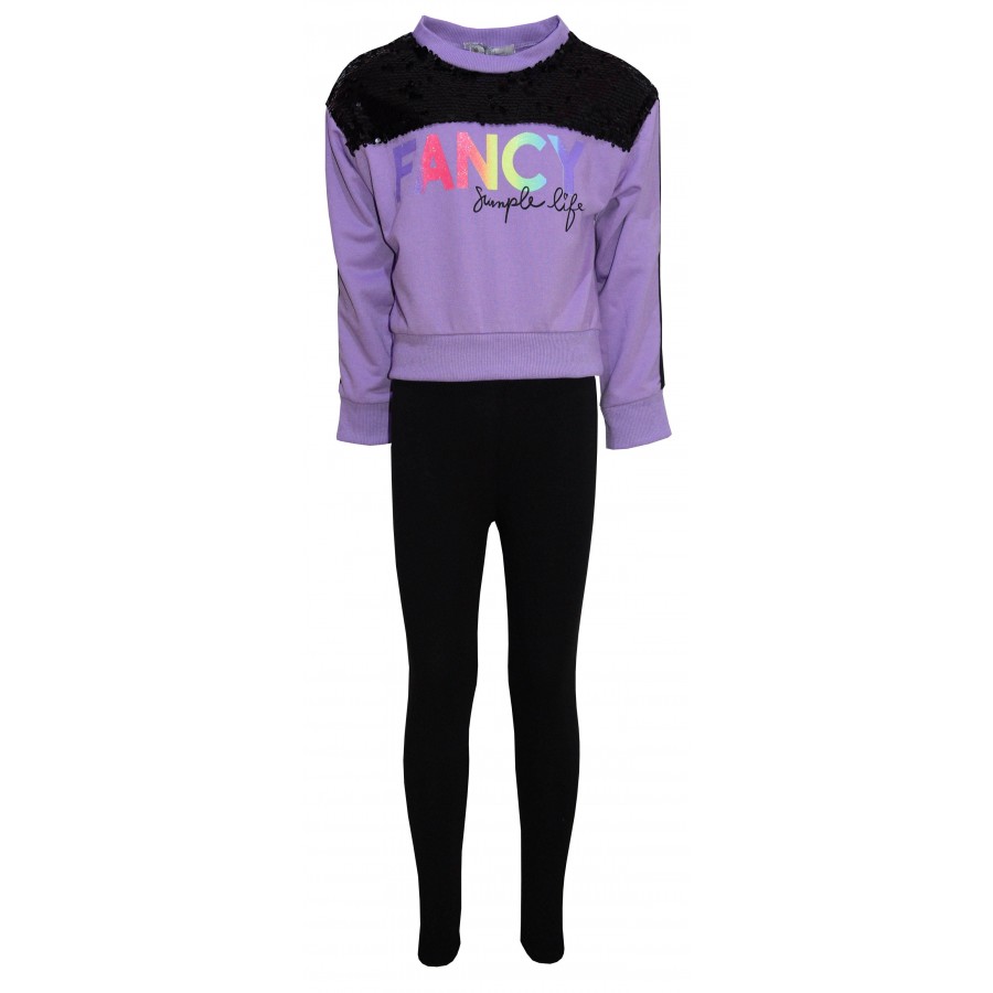 Детски комплект за момиче от две части. Блузата е в лилаво с апликация цветен надпис и черни пайети. Модела е умален. Вижте точни размери на продукта в Описание.