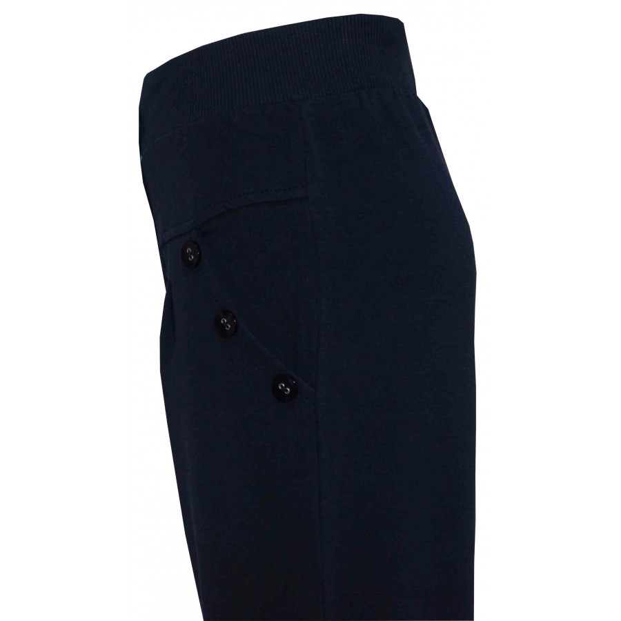 Детско долнище за момиче в тъмносиньо. Модела е стеснен с ластик по крака до под коляното. Странично има зашити копчета без джобове.