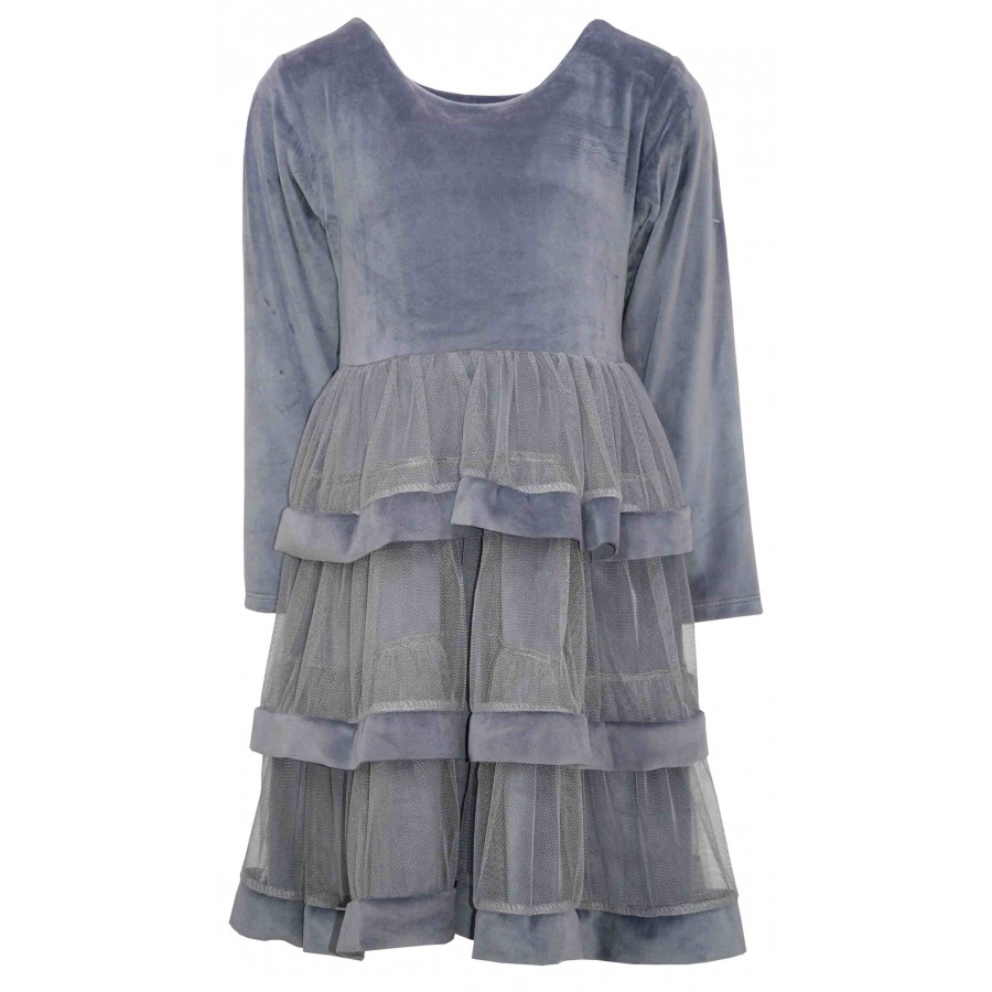 Официална плюшена рокля в сиво на волани с тюл.