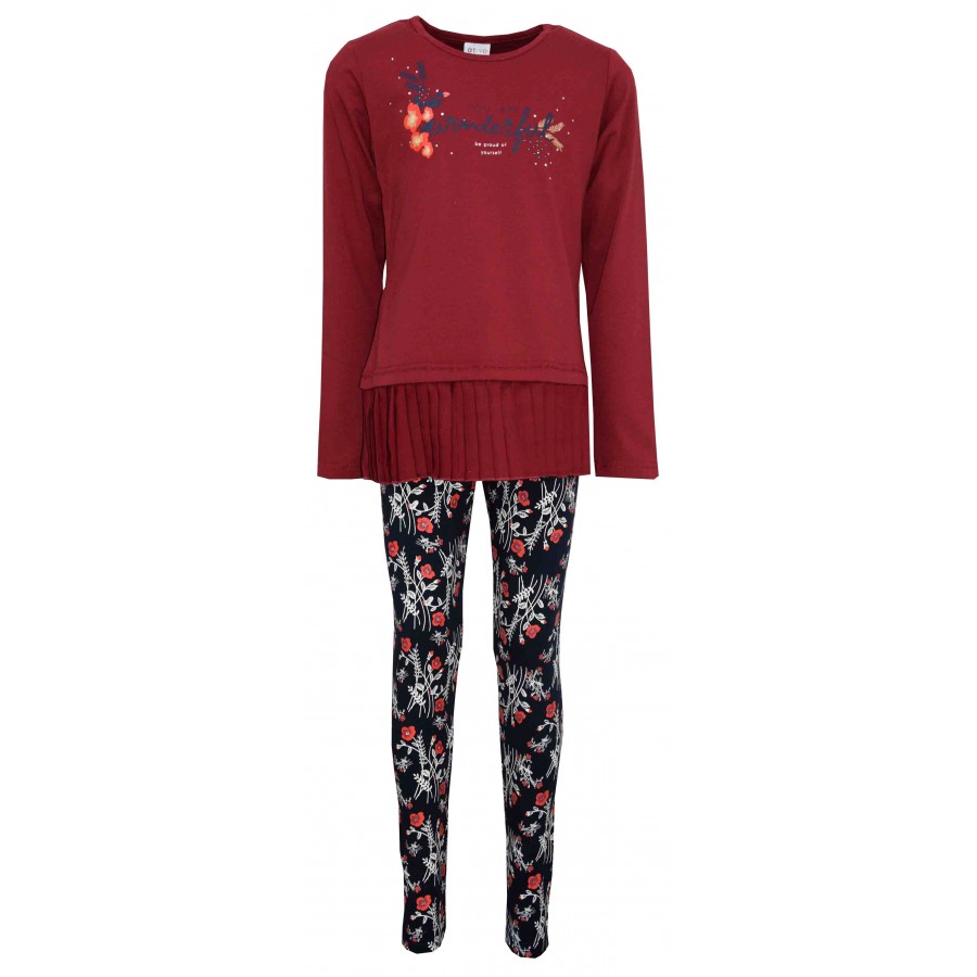 Детски комплект за момиче от две части. Туниката е в червено с красива апликация. Клина е в тъмносиньо на цветя. Модела е от мека и плътна материя.
