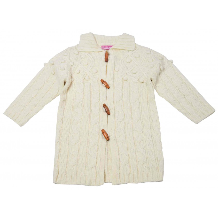 Детска дълга жилетка за момиче в екрю с дървени копчета.