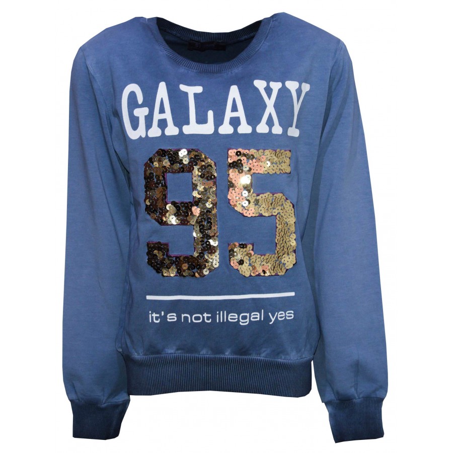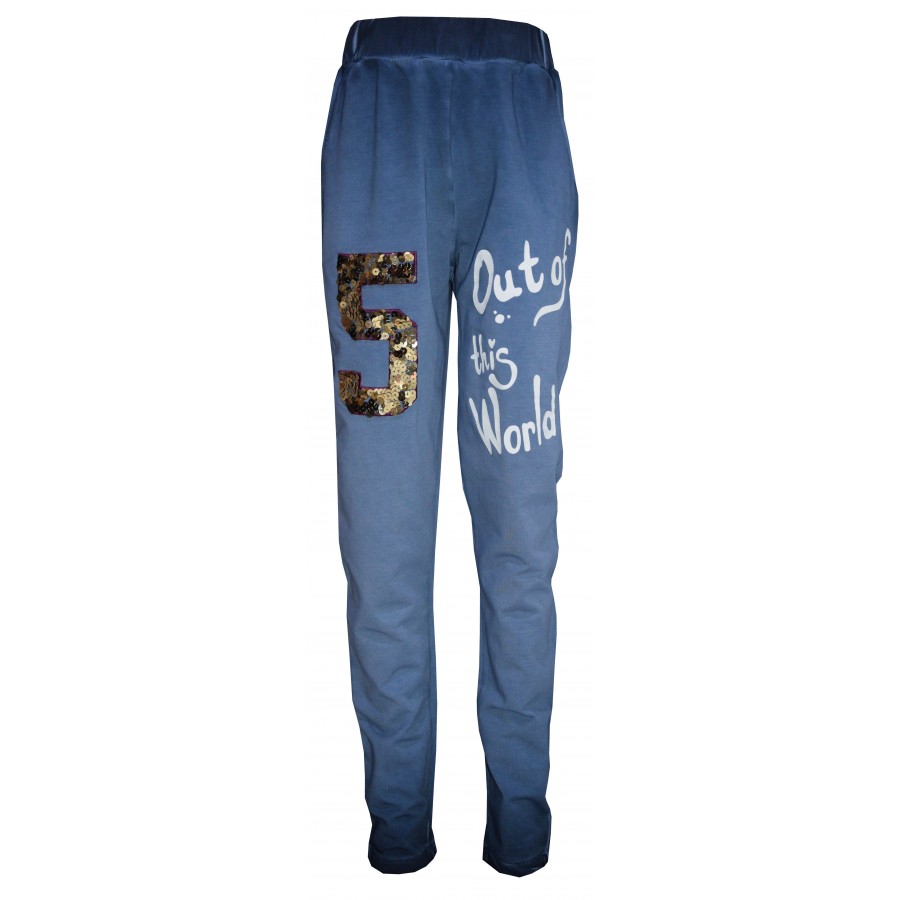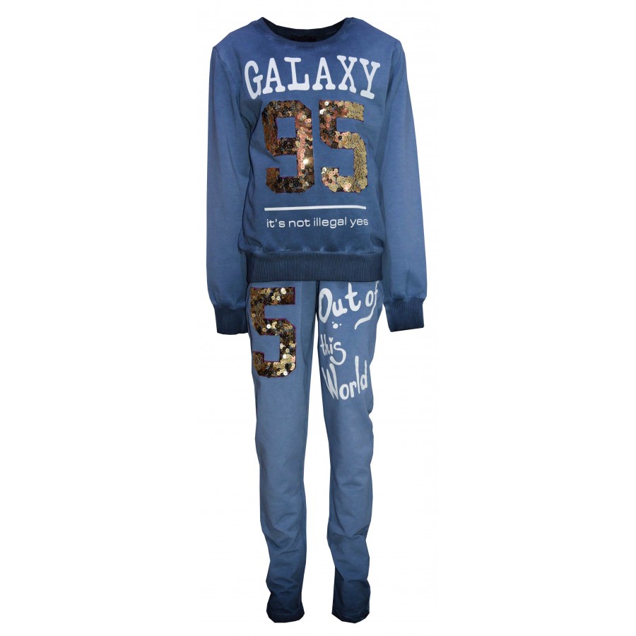 Детски комплект за момиче от пран памук в синьо. Блузата и долнището са с апликация цифри от златисти пайети и надписи.