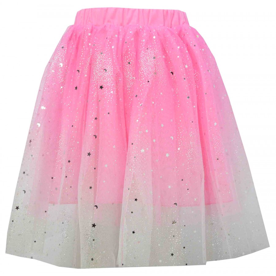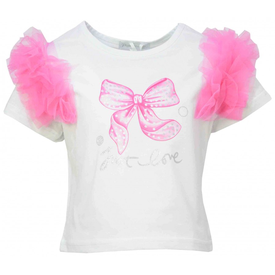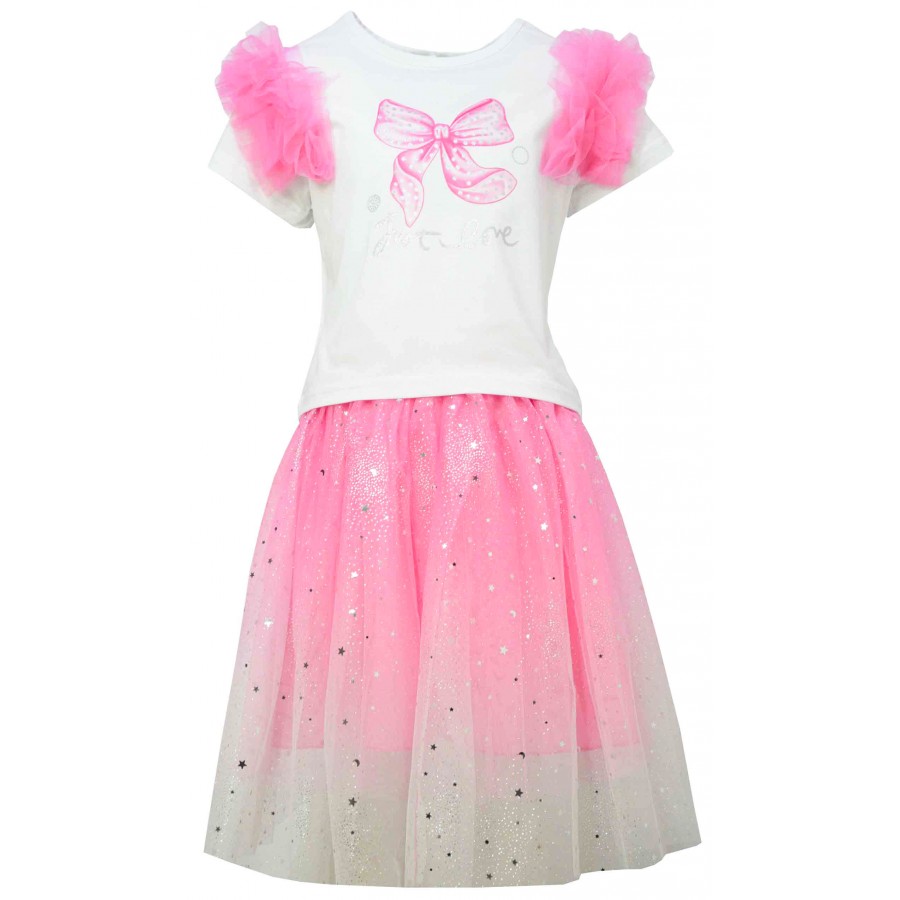 Детски комплект от две части за момиче. Тениската е в бяло с красива апликация и тюл на ръкавите. Полата е от тюл в преливащо цикламено със сребристи звезди и точици.