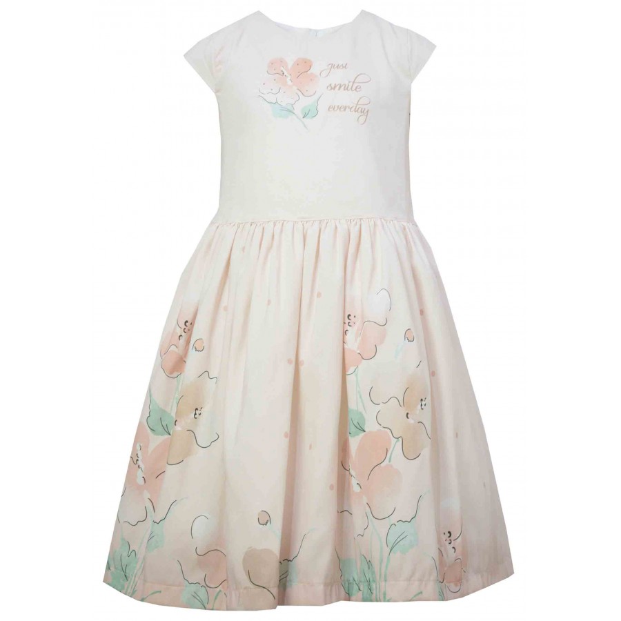 Детски официален комплект от две части за момиче. Роклята е с апликация цветя, на гърба има цип за закопчаване. Жилетката е фино плетиво в розово.