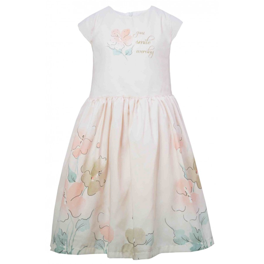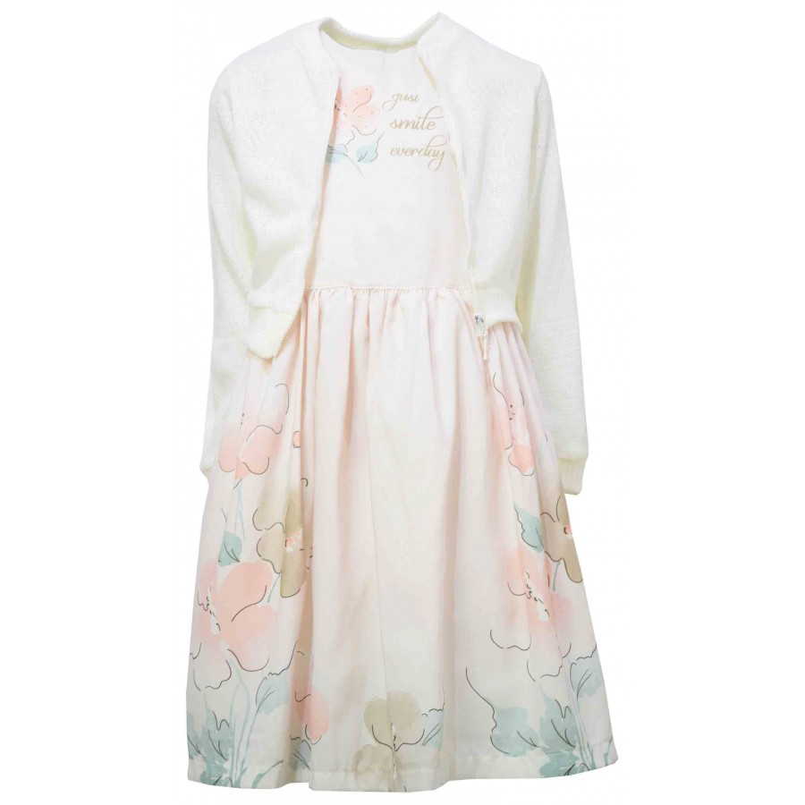 Официален детски комплект от две части за момиче. Роклята е с апликация цветя, на гърба има цип за закопчаване. Жилетката е фино плетиво в екрю.