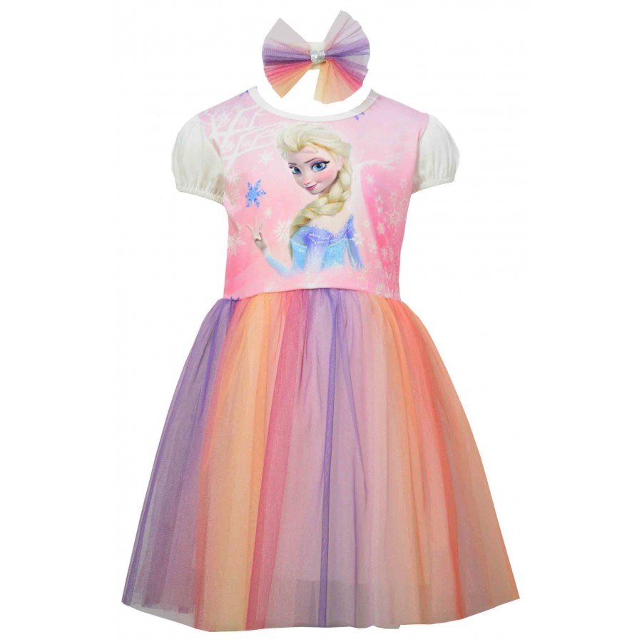 Красива официална детска рокля с красива апликация, изработена от висококачествена материя. Модела е с класическа кройка, къси ръкави, красива апликация и цветен преливащ тюл. Към роклята има красив аксесоар лента за коса. Подходяща е за всякакви поводи. Лесна е за поддръжка, може да се пере в пералня без риск от загуба на форма или цвят.