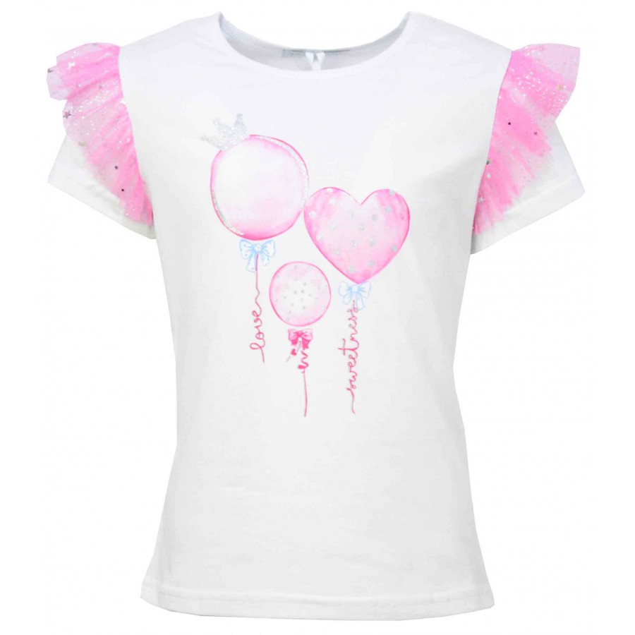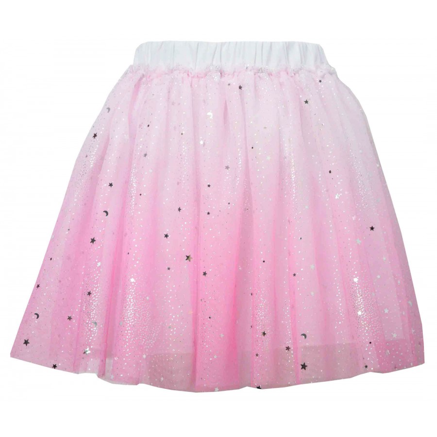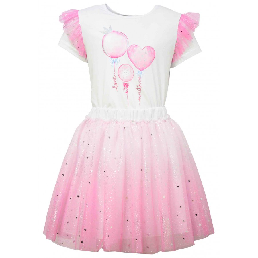 Детски комплект от две части за момиче. Тенискaта е в бяло с красива апликация и тюл на ръкавите. Полата е от тюл в преливащо розово със сребристи звезди и точици.