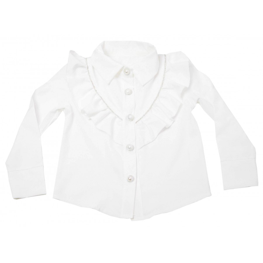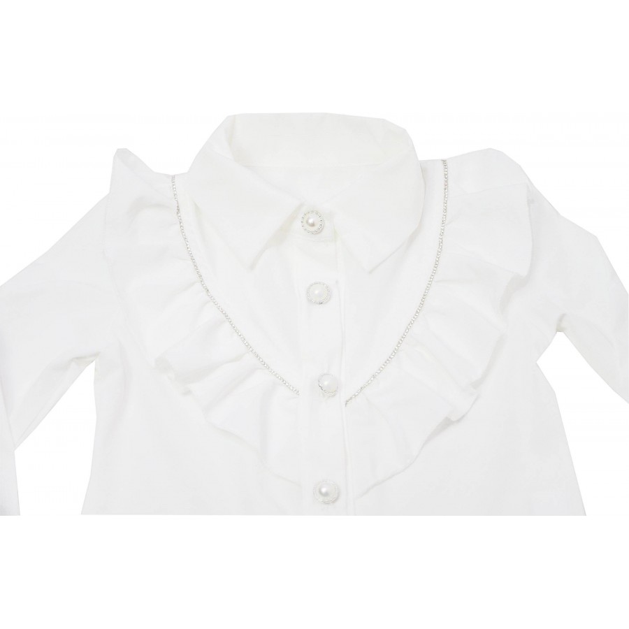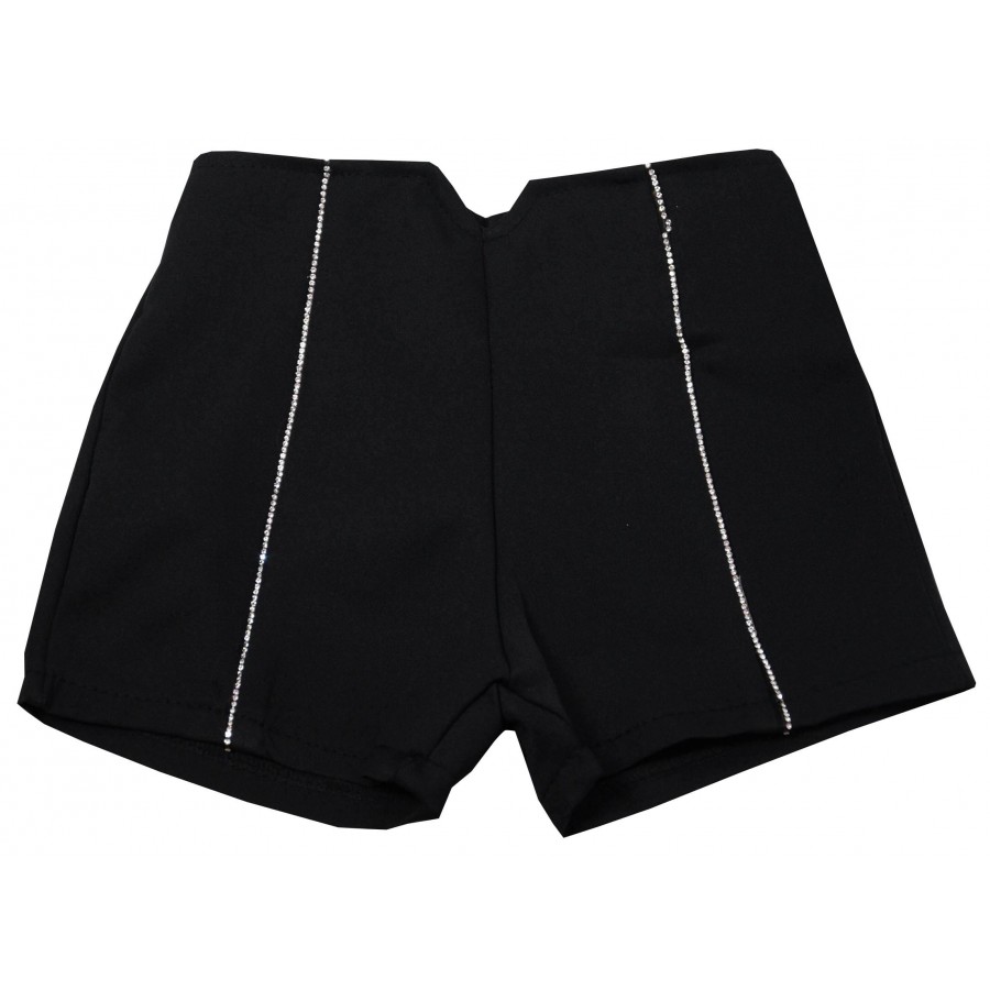 Официален детски комплект за момиче от две части. Ризата е в бяло с къдрици и камъни. Късите панталони са в черно с камъни.