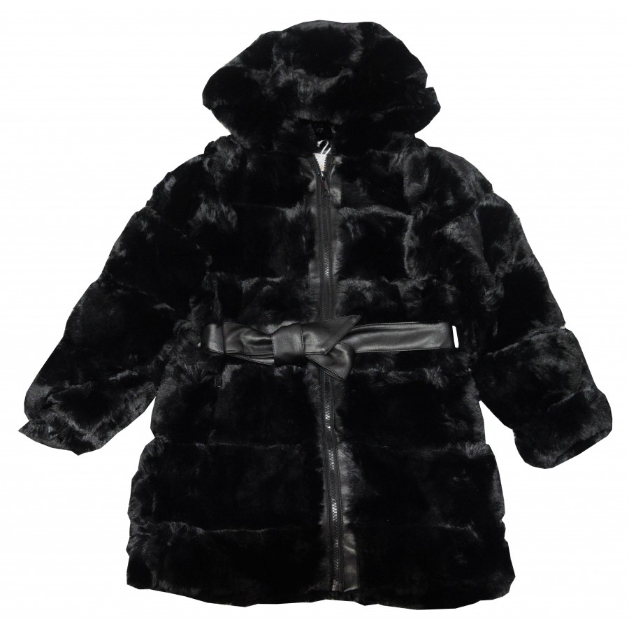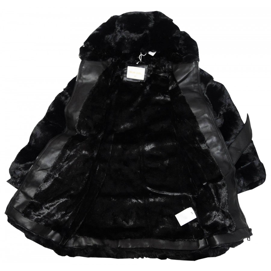 Детско пухкаво дълго палто за момиче в черно. Качулката и пухчето не се отделят от модела. Вътрешната страна е с пухена подплата.
