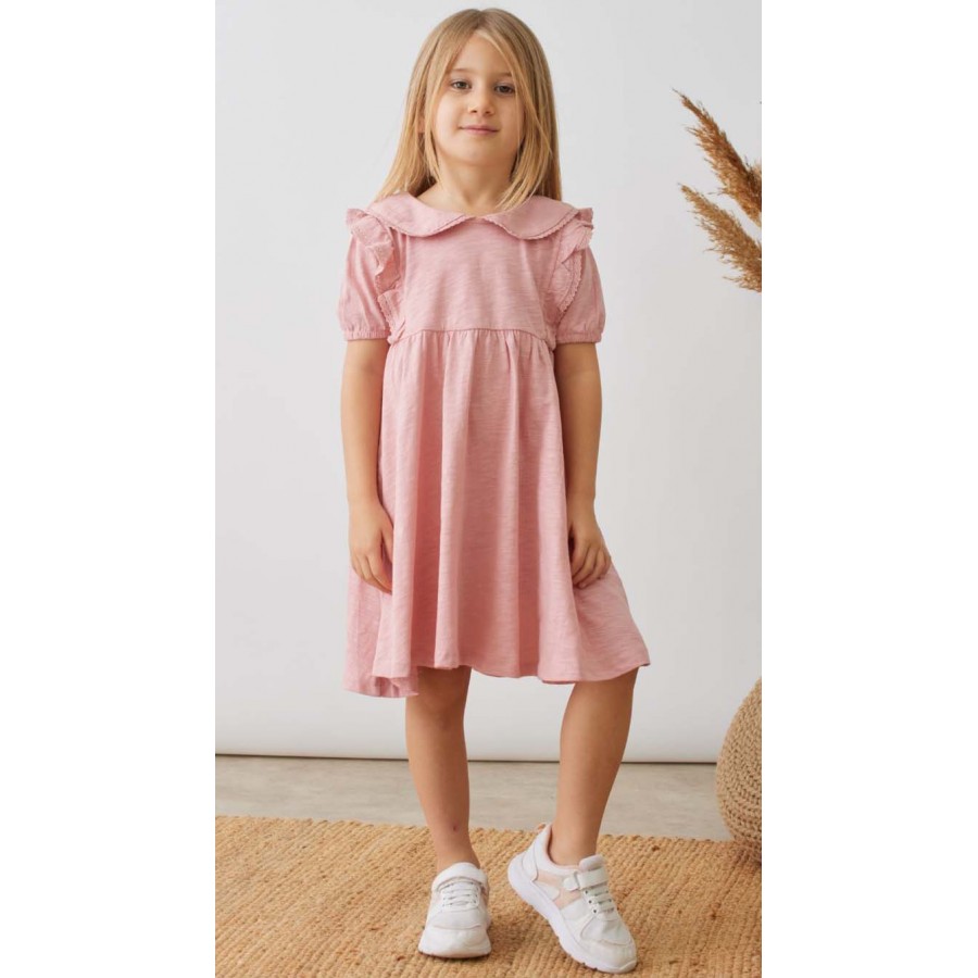 Детска рокля в розово с къдрици в горната част и яка.