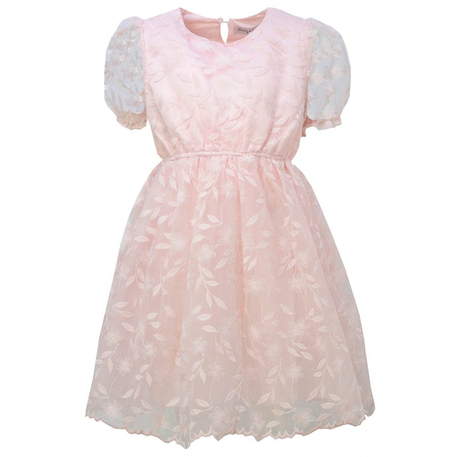 Стилна официална детска рокля в розов цвят, изработена от висококачествена материя. Модела е къси буфан ръкави, ластична талия и бродиран на листа тюл. Роклята на гърба има копче за лесно обличане и събличане. Подходяща е за кръщенета, рожденни дни и сватби. Лесна е за поддръжка, може да се пере в пералня без риск от загуба на форма или цвят.
