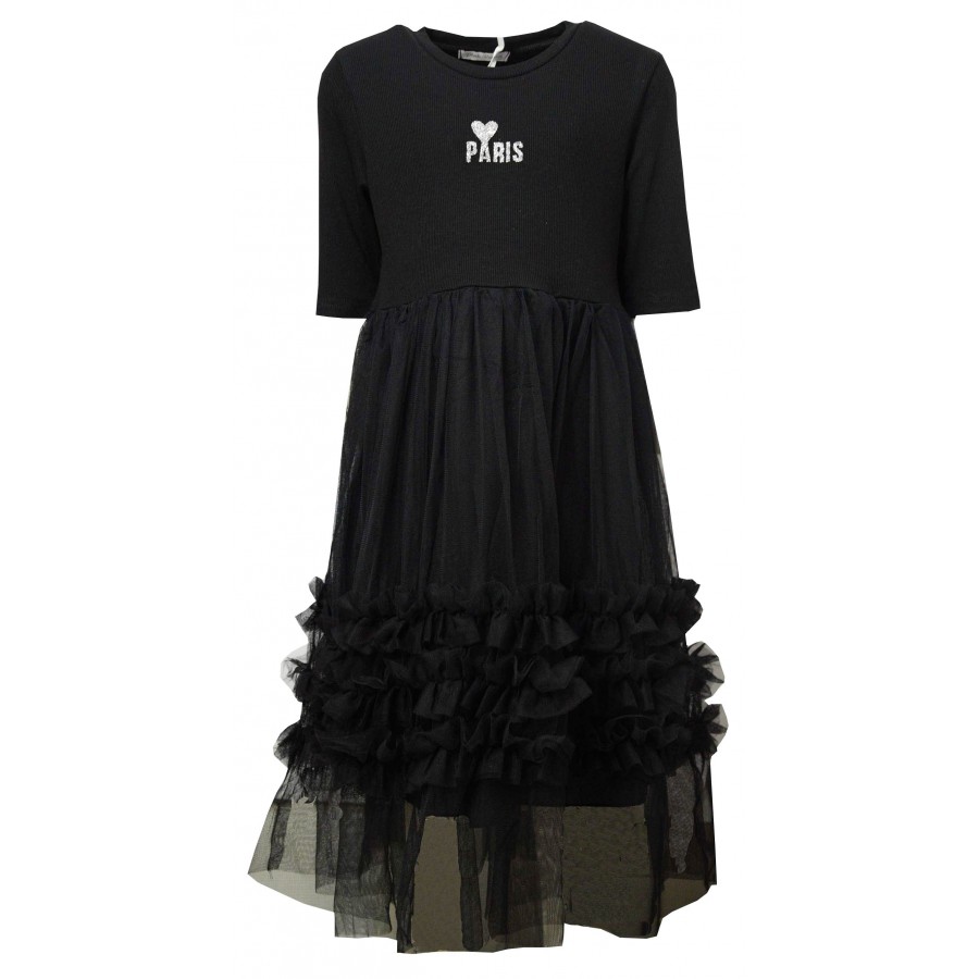 Детска рокля в черно с тюл. Горната част е от мека и фина материя рипс с апликация надпис.