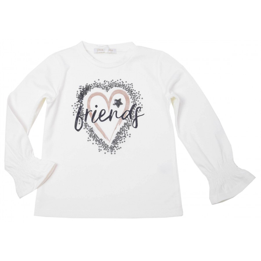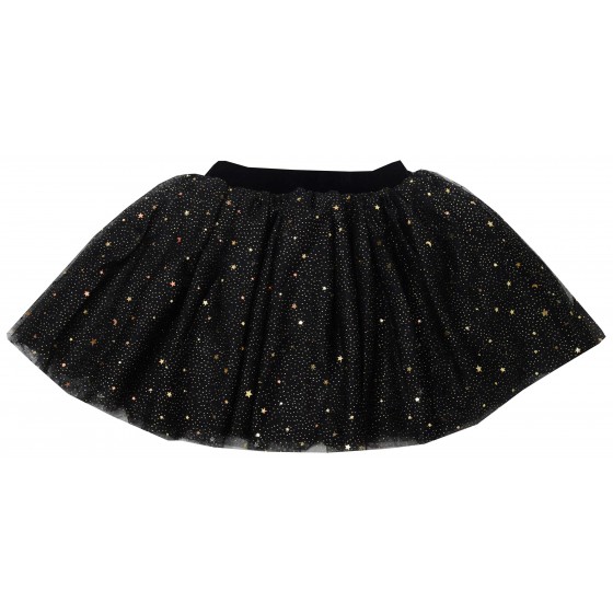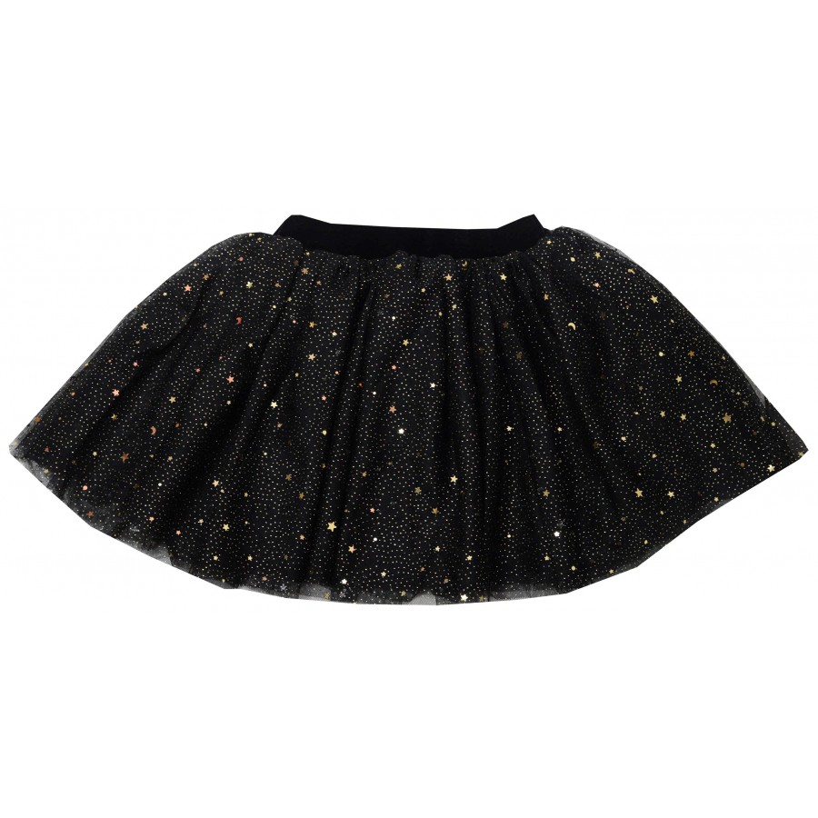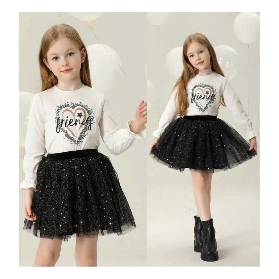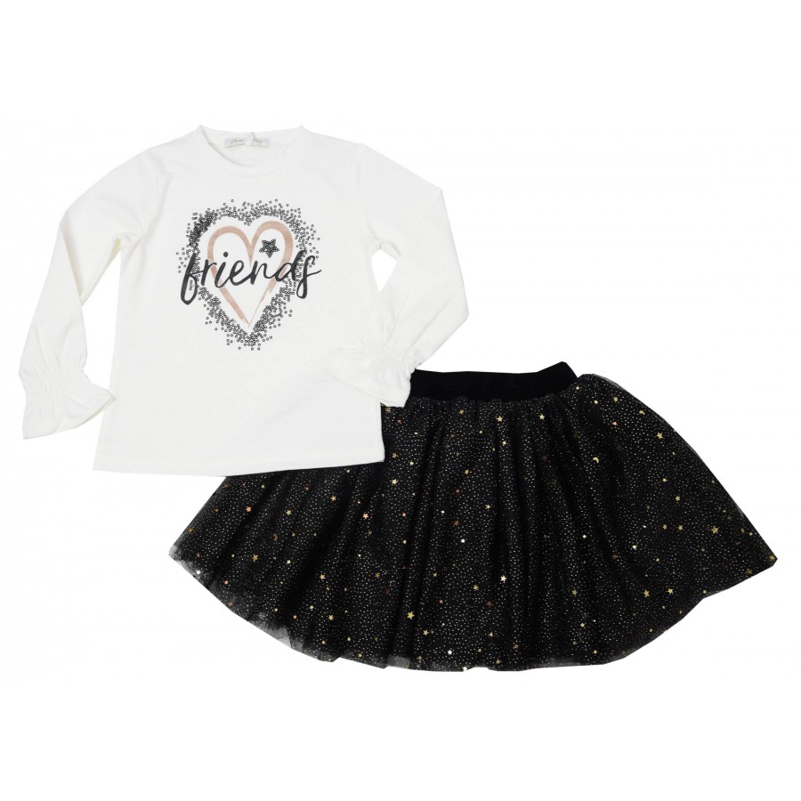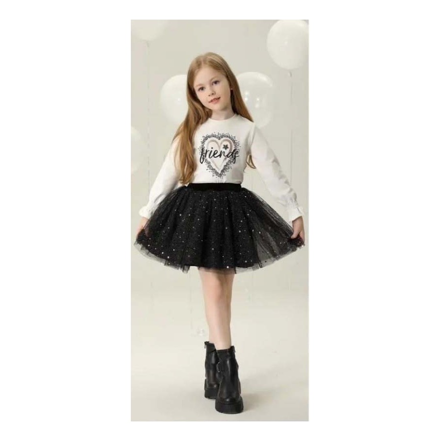 Детски комплект за момиче от две части с блуза и пола. Блузата е в екрю с красива апликация и ластик на ръкавите. Полата е с тюл на звездички, подплатата е от фин полар.