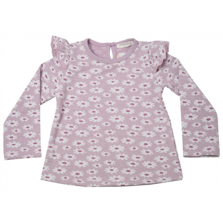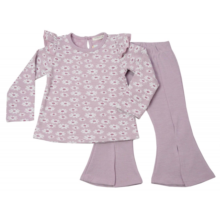 Красив и практичен детски комплект за момиче от две части с блуза и панталон. Модела е изработен от висококачествена материя. Блузата е в пастелен цвят лилаво с принт на цветя и къдрици на раменете. Панталона е в лилаво тип чарлстон с цепки отпред и ластична талия. Този комплект осигурява удобство и свобода на движението през целия ден. Подходящ е за ежедневни игри и разходки. Лесен за поддръжка, комплектът може да се пере в пералня без риск от загуба на форма или цвят.