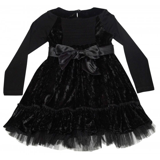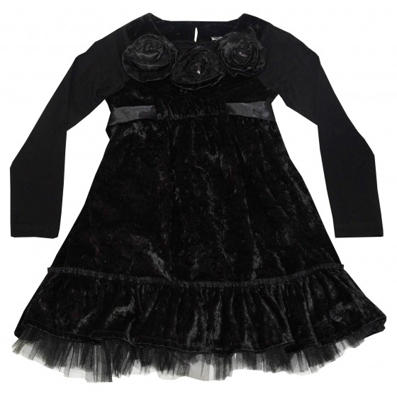 Официална детска рокля от черен плюш с цветя в горната част и пришит тюл в долната част. Модела е с класическа кройка, дължина до коляно обло бие и дълги ръкави. Роклята на гърба в горната част има набран ластик и копче на врата за лесно обличане и събличане. Подходяща е за всеки официален повод.