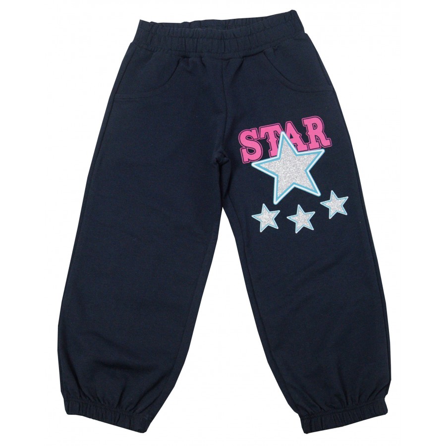 Детско долнище за момиче в тъмносиньо с апликация звезди, ластик на талията и глезените. Модела е от висококачествена материя. Подходящ е да се комбинира с блузи, худита и суитшърти. Практичен и удобен за ежедневни игри и разходки.