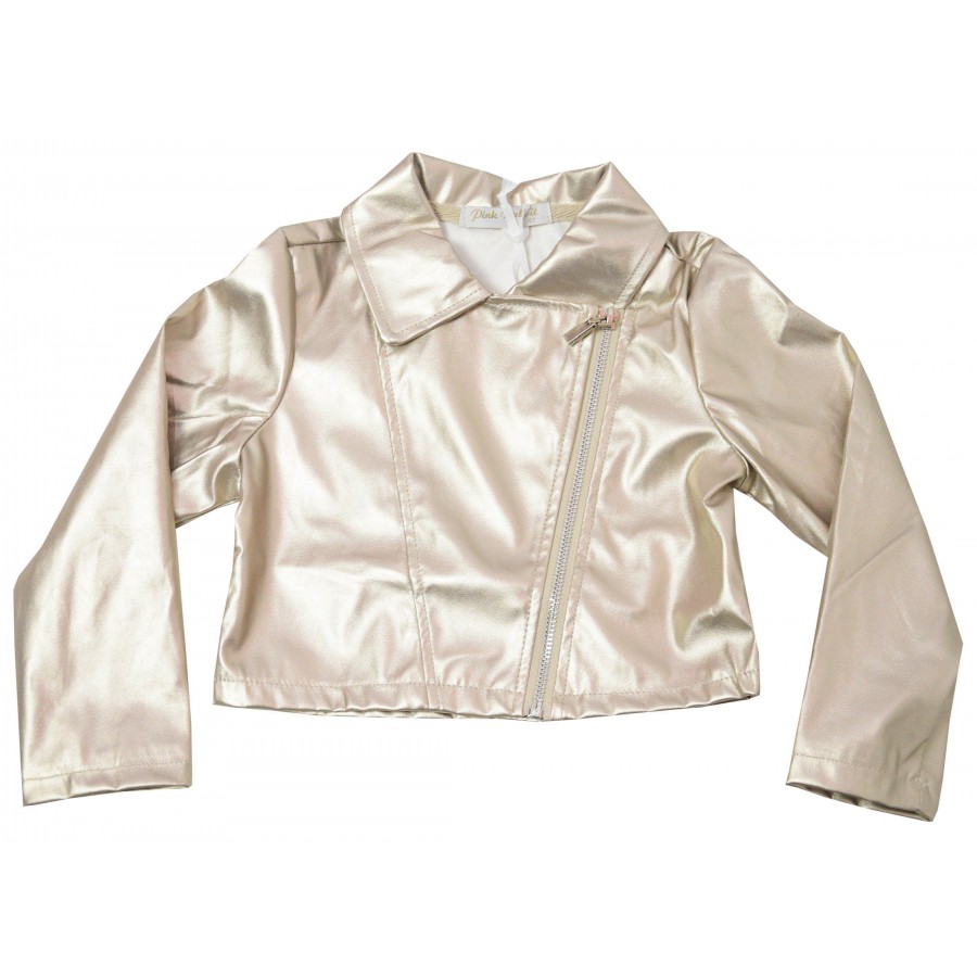 Красив детски комплект за момиче от две части, изработен от висококачествени материи. Якето е от изкуствена кожа в златисто с дълги ръкави, закопчаване с цип и яка. Роклята е с обло бие, къс ръкав и тюл на животински шарки. Комплекта е подходящ, както за официални поводи, така и за ежедневието.