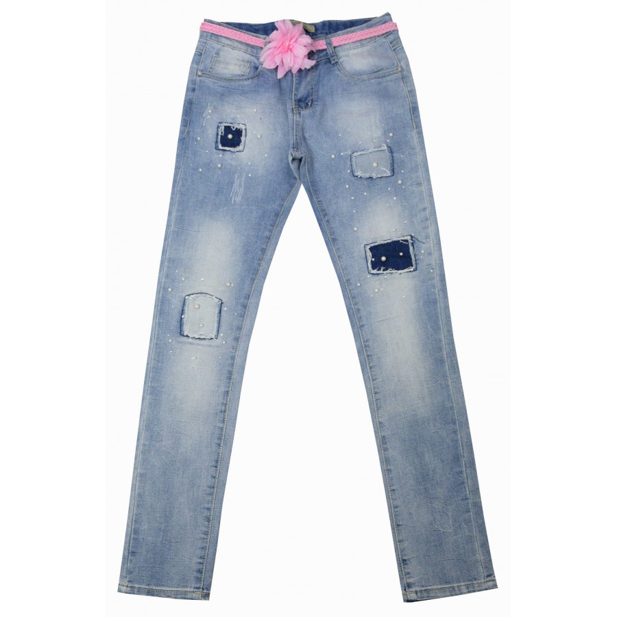 Детски пролетни дънки за момиче в светлосиньо с избелял ефект, декоративни кръпки, перли и аксесоар колан.