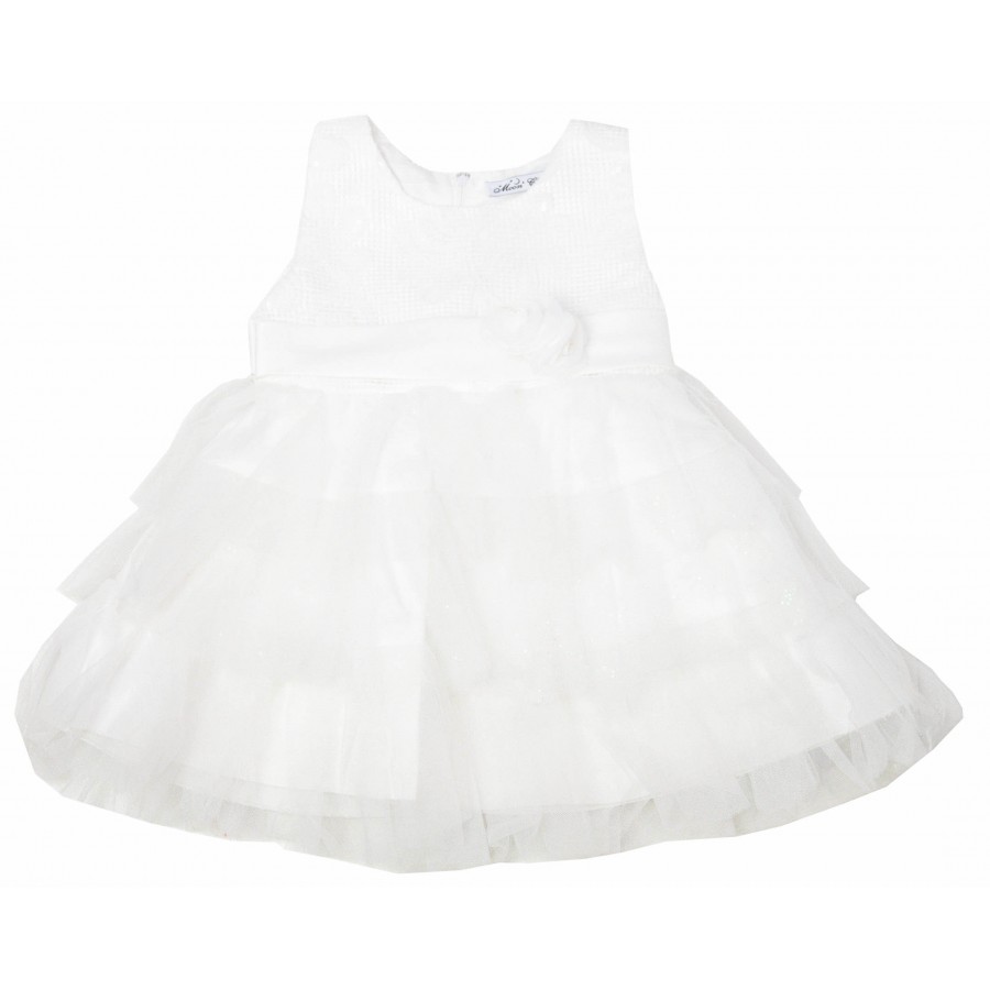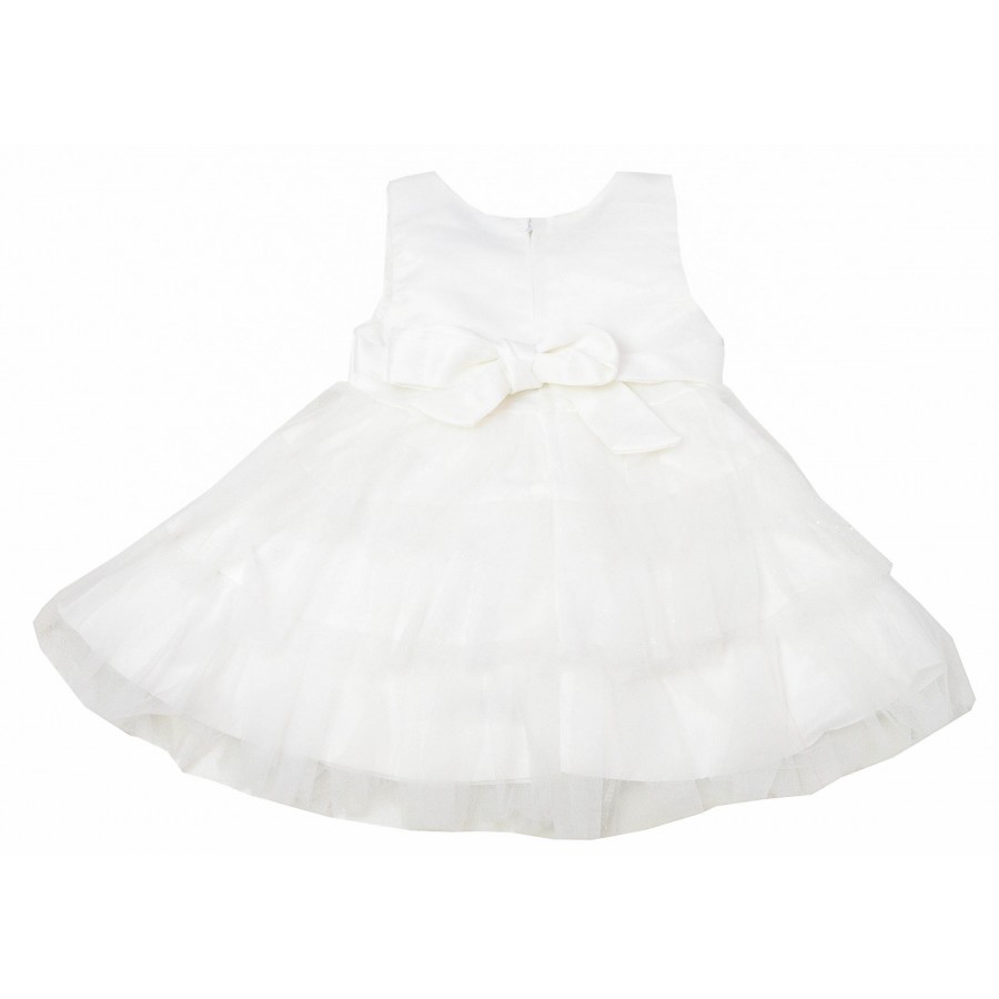 Красива официална детска рокля в цвят екрю, изработена от висококачествена материя. Модела е без ръкави, горната част е с бродерия, долната част е от тюл с фин брокат на волани. На талията в предната част има пришит сатенен колан с цвете. Роклята на гърба има цип за лесно обличане и събличане и сатенен колан за регулиране на талията. Подходяща е за кръщенета, рожденни дни и сватби. Лесна е за поддръжка, може да се пере в пералня без риск от загуба на форма или цвят.