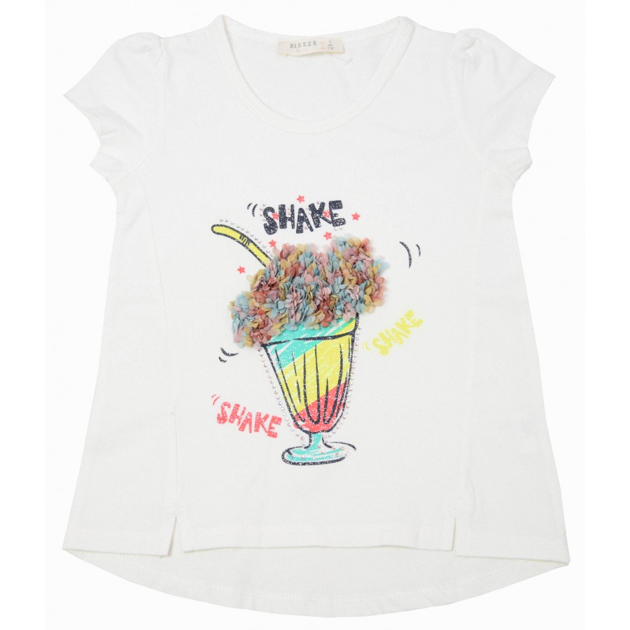 Красива детска тениска за момиче в цвят екрю с цветна 3D апликация, изработена от висококачествена материя. Тениската е с класическа кройка и къси ръкави. Модела осигурява удобство и свобода на движението през целия ден. Лесна за поддръжка, тениската може да се пере в пералня без риск от загуба на форма или цвят.