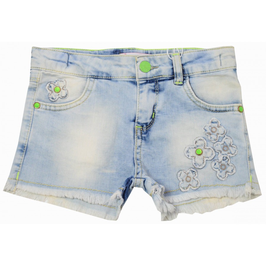Красиви детски къси дънкови панталони за момиче, изработени от висококачествена материя. Модела е в светлосин цвят, избелял ефект, бродерия цветя и декоративни капси и копче в зелено. На гърба има джоб с бродерия на цветя, а другият е с имитация на разшит джоб. Закопчаването на талията е с копче и цип, от вътрешната страна има ластик за регулиране на талията. Късите дънкови панталони лесно се съчетават с тениски или потници, подходящи за ежедневни игри и разходки. Лесни за поддръжка, късите панталони може да се перат в пералня без риск от загуба на форма или цвят.