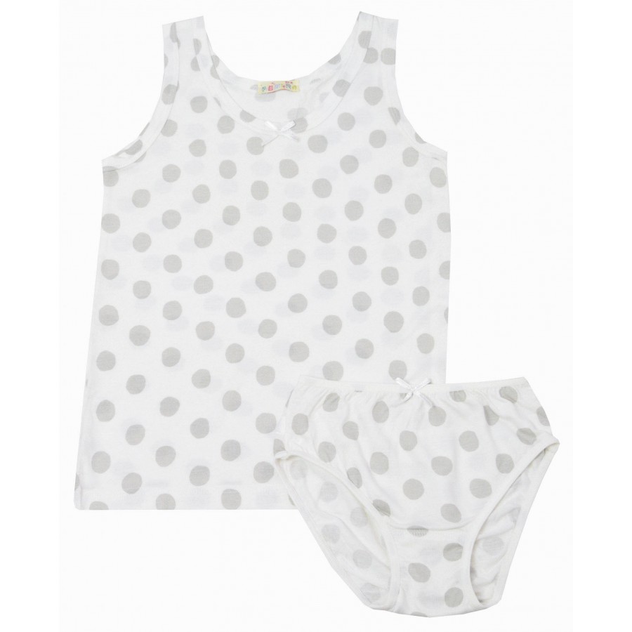 Детски комплект бельо за момиче с потник и бикини в бяло на сиви точки. Потника е с класическа кройка и широки презрамки, които осигуряват комфорт при продължително носене. Лесен за поддръжка, комплектът може да се пере в пералня без риск от загуба на форма или цвят.