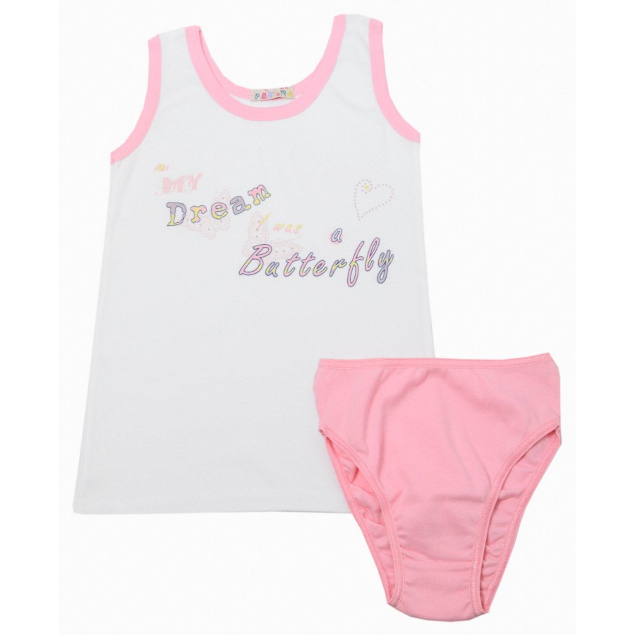 Детски комплект бельо за момиче с бял потник с апликация надписи и розови бикини. Потника е с класическа кройка и широки презрамки, които осигуряват комфорт при продължително носене. Лесен за поддръжка, комплектът може да се пере в пералня без риск от загуба на форма или цвят.