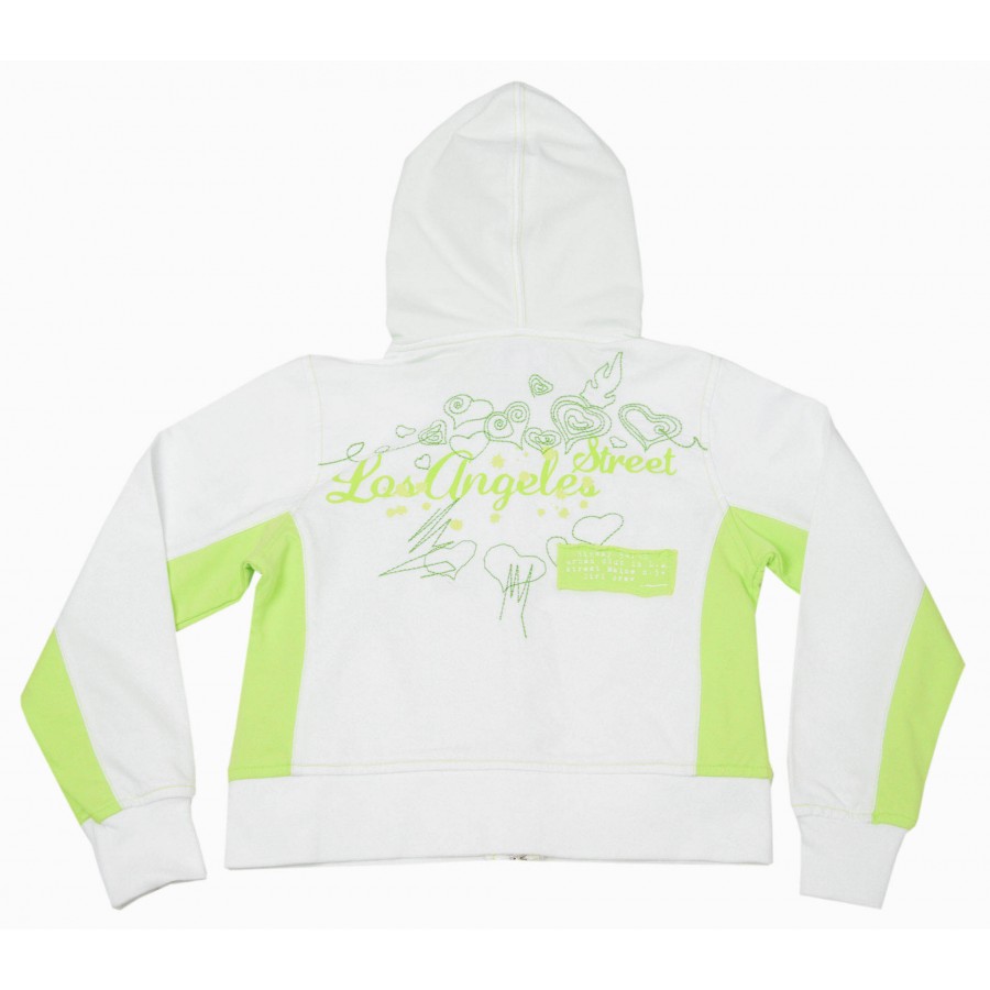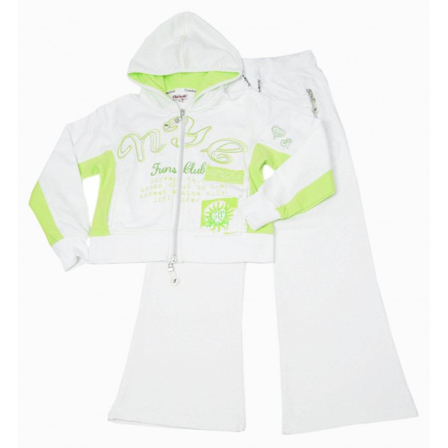 Красив детски комплект за момиче от две части със суитшърт и долнище. Модела е изработен от висококачествена материя. Суитшърта е в бял цвят със зелена бродерия на надписи в предната част и на гърба, дълги ръкави, качулка и закопчаване с цип. Долнището е изистено в бяло тип чарлстон, джобове и ластична талия. Този комплект осигурява удобство и свобода на движението през целия ден. Подходящ е за ежедневието, училище и всякакъв вид спорт. Лесен за поддръжка, комплектът може да се пере в пералня без риск от загуба на форма или цвят.