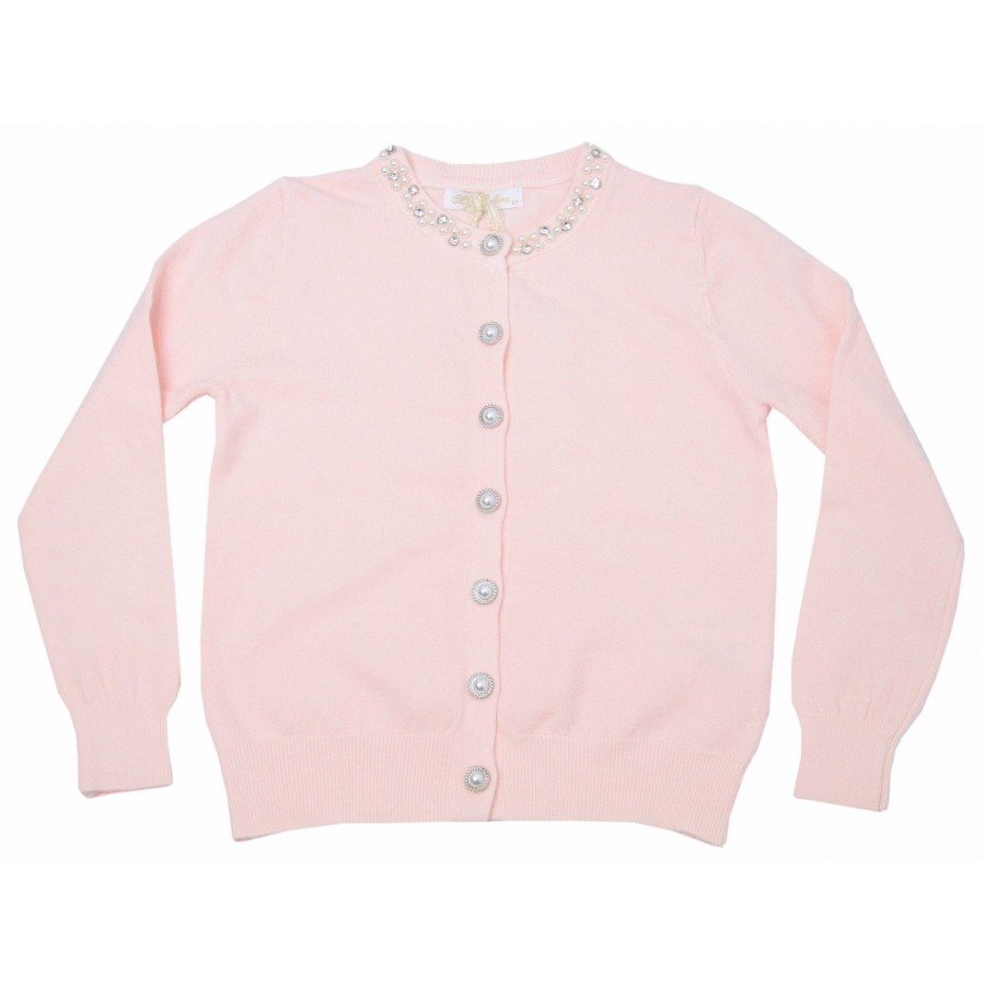 Детска жилетка за момиче от фино плетиво с красиви копчета и декорирана с камъни с перли по врата.